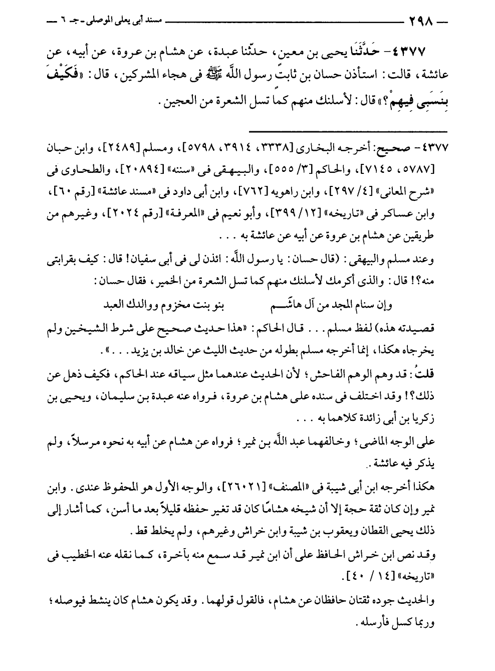 ٤٣٧٧ - حَدَّثَنَا يحيى بن معينٍ، حدّثنا عبدة، عن هشام بن عروة، عن أبيه، عن عائشة، قالت: استأذن حسان بن ثابتٍ رسول الله - صلى الله عليه وسلم - في هجاء المشركين، قال: "فَكَيْفَ بِنَسَبِى فِيهِمْ؟ " قال: لأسلنك منهم كما تسل الشعرة من العجين.