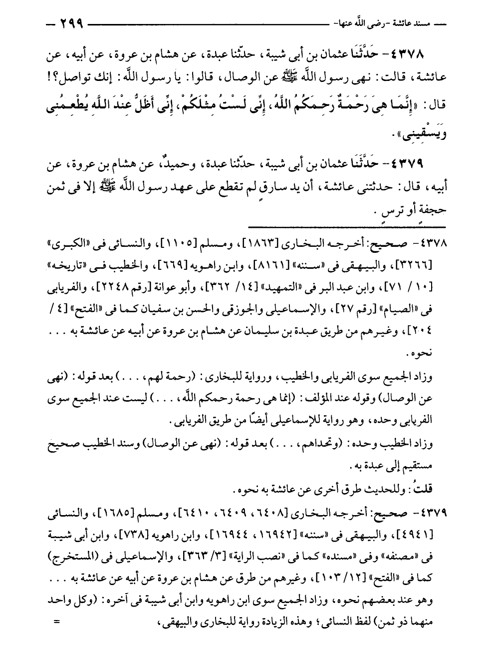 ٤٣٧٤ - صحيح: أخرجه البخارى [٦٤٠٨، ٦٤٠٩، ٦٤١٠]، ومسلم [١٦٨٥]، والنسائى [٤٩٤١]، والبيهقى في "سننه" [١٦٩٤٢، ١٦٩٤٤]، وابن راهويه [٧٣٨]، وابن أبى شيبة في "مصنفه" وفى "مسنده" كما في "نصب الراية" [٣/ ٣٦٣]، والإسماعيلى في (المستخرج) كما في "الفتح" [١٢/ ١٠٣]، وغيرهم من طرق عن هشام بن عروة عن أبيه عن عائشة به ...