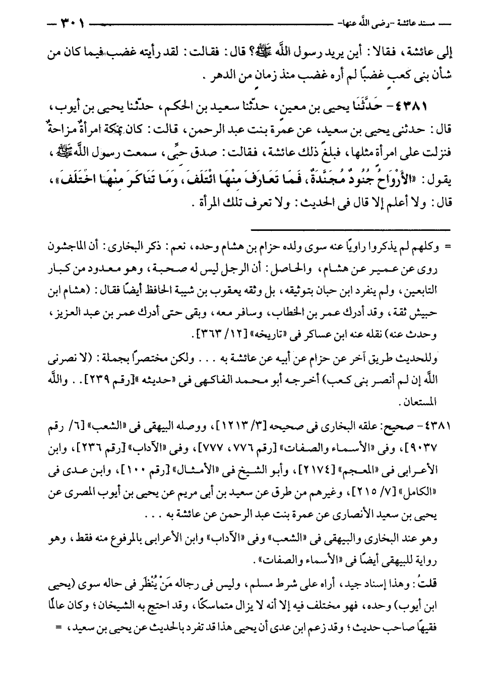 ٤٣٨١ - حَدَّثنَا يحيى بن معينٍ، حدّثنا سعيد بن الحكم، حدثنا يحيى بن أيوب، قال: حدثنى يحيى بن سعيدٍ، عن عمرة بنت عبد الرحمن، قالت: كان بمكة أمرأةٌ مزاحةٌ فنزلت على امرأةٍ مثلها، فبلغ ذلك عائشة، فقالت: صدق حِبِّى، سمعت رسول الله - صلى الله عليه وسلم -، يقول: "الأَرْوَاحُ جُنُودٌ مُجَنَّدَةٌ، فَمَا تَعَارَفَ مِنْهَا ائْتَلَفَ، ومَا تَنَاكَرَ مِنْهَا اختَلَفَ"، قال: ولا أعلم إلا قال في الحديث: ولا تعرف تلك المرأة.