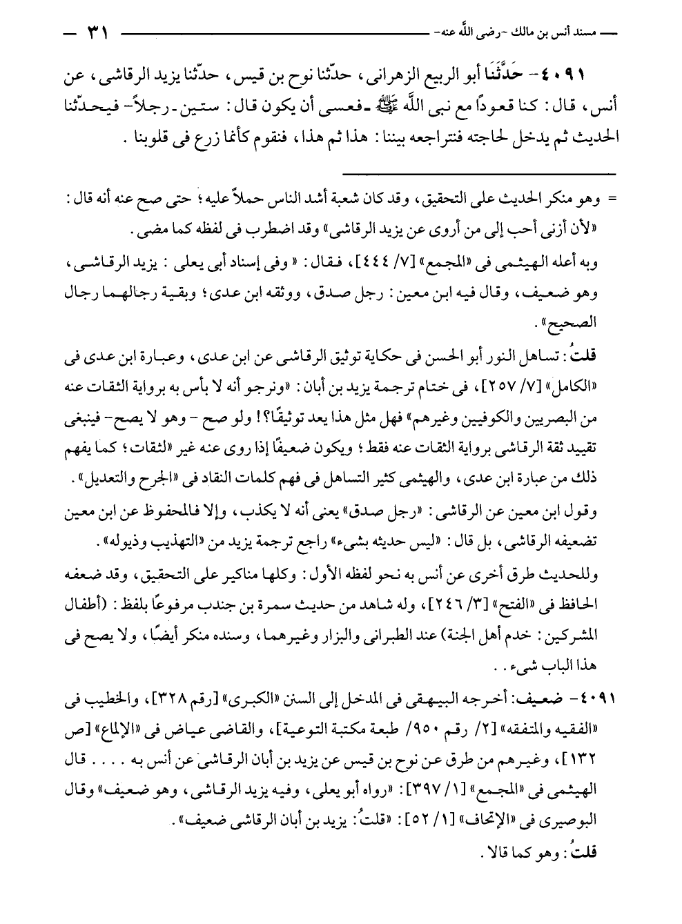 قلتُ: تساهل النور أبو الحسن في حكاية توثيق الرقاشي عن ابن عدي، وعبارة ابن عدي في "الكامل" [٧/ ٢٥٧]، في ختام ترجمة يزيد بن أبان: "ونرجو أنه لا بأس به برواية الثقات عنه من البصريين والكوفيين وغيرهم" فهل مثل هذا يعد توثيقًا؟! ولو صح - وهو لا يصح - فينبغى تقييد ثقة الرقاشي برواية الثقات عنه فقط؛ ويكون ضعيفا إذا روى عنه غير "لثقات؛ كما يفهم ذلك من عبارة ابن عدي، والهيثمى كثير التساهل في فهم كلمات النقاد في "الجرح والتعديل".