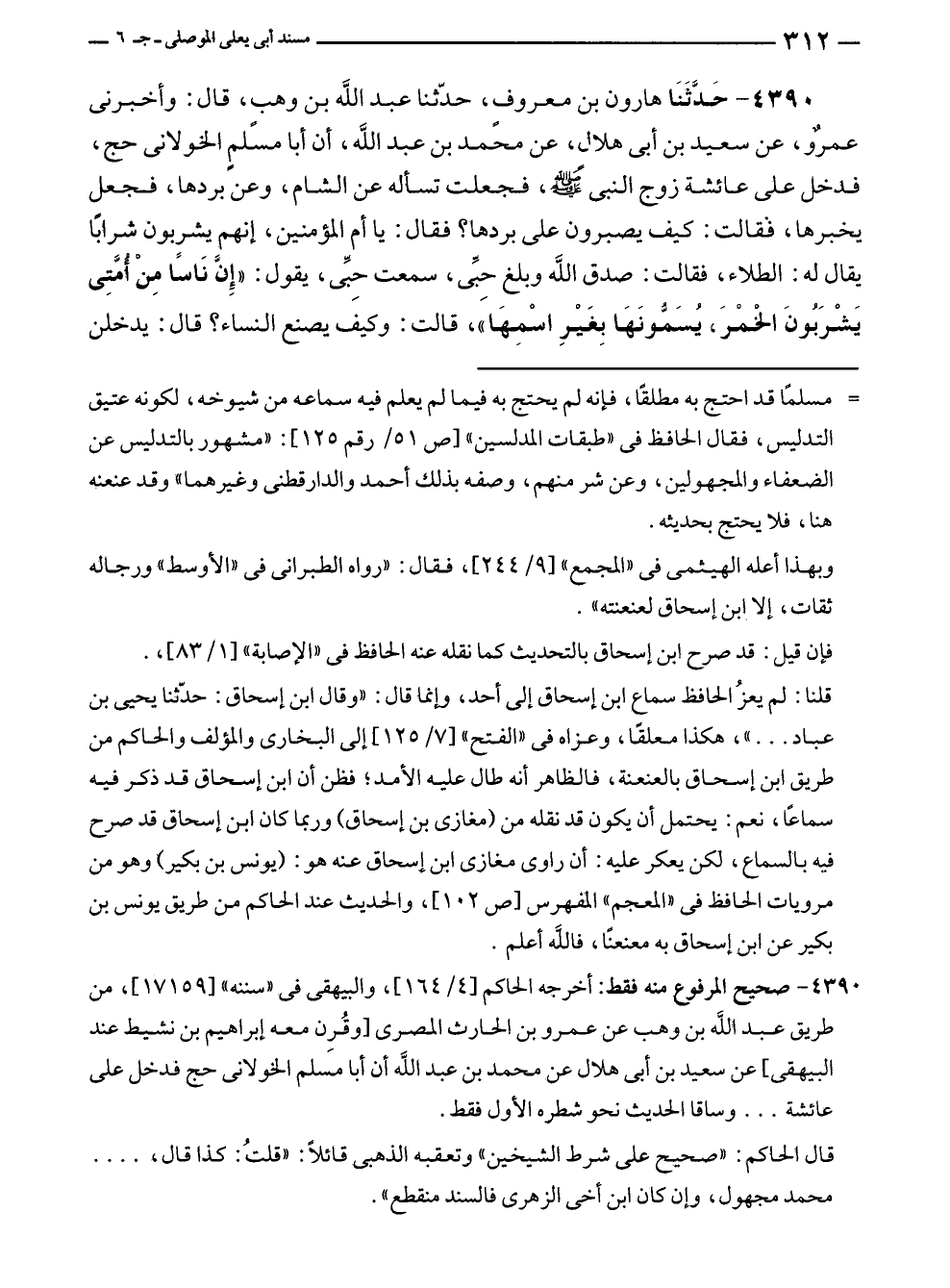 ٤٣٩٠ - حَدَّثَنَا هارون بن معروفٍ، حدّثنا عبد الله بن وهبٍ، قال: وأخبرنى عمرٌو، عن سعيد بن أبى هلال، عن محمد بن عبد الله، أن أبا مسلمٍ الخولانى حج، فدخل على عائشة زوج النبي - صلى الله عليه وسلم -، فجعلت تسأله عن الشام، وعن بردها، فجعل يخبرها، فقالت: كيف يصبرون على بردها؟ فقال: يا أم المؤمنين، إنهم يشربون شرابًا يقال له: الطلاء، فقالت: صدق الله وبلغ حِبِّى، سمعت حِبِّى، يقول: "إنَّ نَاسًا مِنْ أُمَّتِى يَشْرَبُونَ الخمْرَ، يُسَمُّونَهَا بِغَيْرِ اسْمِهَا"، قالت: وكيفَ يصنع النساء؟ قال: يدخلن