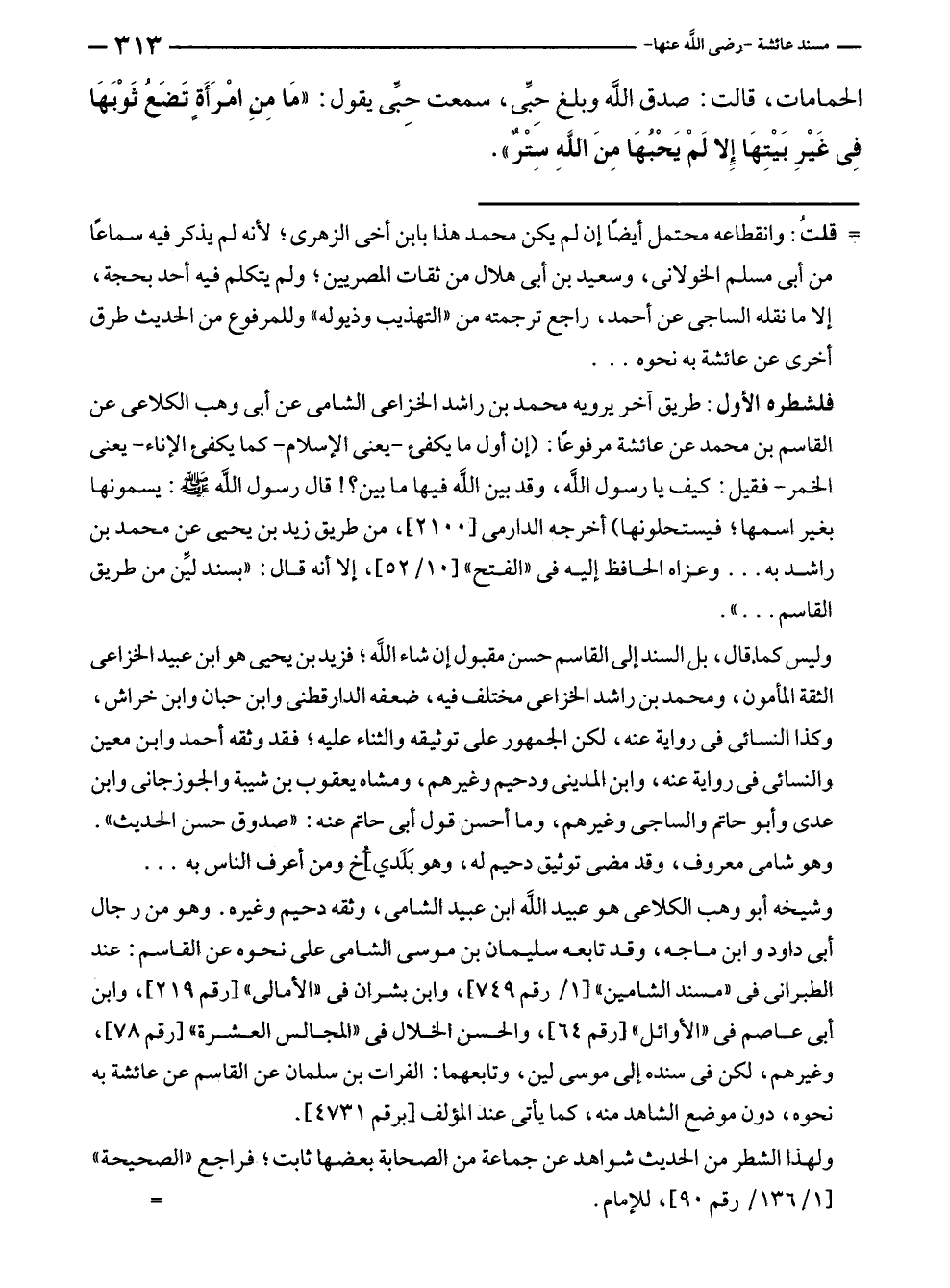 = قلتُ: وانقطاعه محتمل أيضًا إن لم يكن محمد هذا بابن أخى الزهرى؛ لأنه لم يذكر فيه سماعًا من أبى مسلم الخولانى، وسعيد بن أبى هلال من ثقات المصريين؛ ولم يتكلم فيه أحد بحجة، إلا ما نقله الساجى عن أحمد، راجع ترجمته من "التهذيب وذيوله" وللمرفوع من الحديث طرق أخرى عن عائشة به نحوه ...