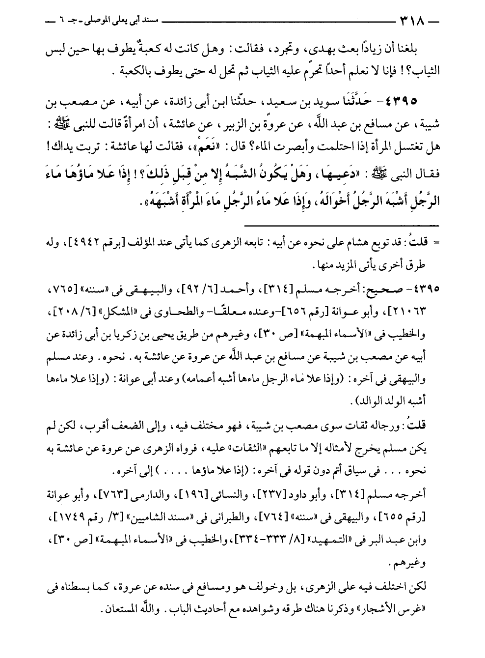 ٤٣٩٥ - حَدَّثَنَا سويد بن سعيد، حدّثنا ابن أبى زائدة، عن أبيه، عن مصعب بن شيبة، عن مسافع بن عبد الله، عن عروة بن الزبير، عن عائشة، أن امرأة قالت للنبى - صلى الله عليه وسلم -: هل تغتسل المرأة إذا احتلمت وأبصرت الماء؟ قال: "نَعَمْ"، فقالت لها عائشة: تربت يداك! فقال النبي - صلى الله عليه وسلم -: "دَعِيهَا، وَهَلْ يَكُونُ الشَّبَهُ إِلا مِنْ قِبَلِ ذَلِكَ؟! إِذَا عَلا مَاؤُهَا مَاءَ الرَّجُلِ أَشْبَهَ الرَّجُلُ أَخْوَالَهُ، وَإِذَا عَلا مَاءُ الرَّجُلِ مَاءَ المرْأَةِ أَشْبَهَهُ".