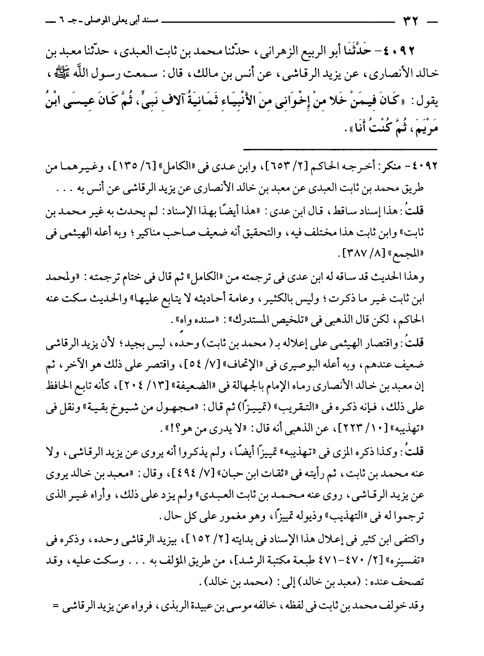 ٤٠٩٢ - حَدَّثَنَا أبو الربيع الزهرانى، حدّثنا محمد بن ثابت العبدى، حدّثنا معبد بن خالد الأنصاري، عن يزيد الرقاشي، عن أنس بن مالك، قال: سمعت رسول الله - صلى الله عليه وسلم -، يقول: "كَانَ فِيمَنْ خَلا مِنْ إِخوَانِى مِنَ الأَنْبِيَاءِ ثَمَانِيَةُ آلافِ نَبِيٍّ، ثمَّ كَانَ عِيسَى ابْن مَرْيَمَ، ثُمَّ كُنْتُ أَنَا".