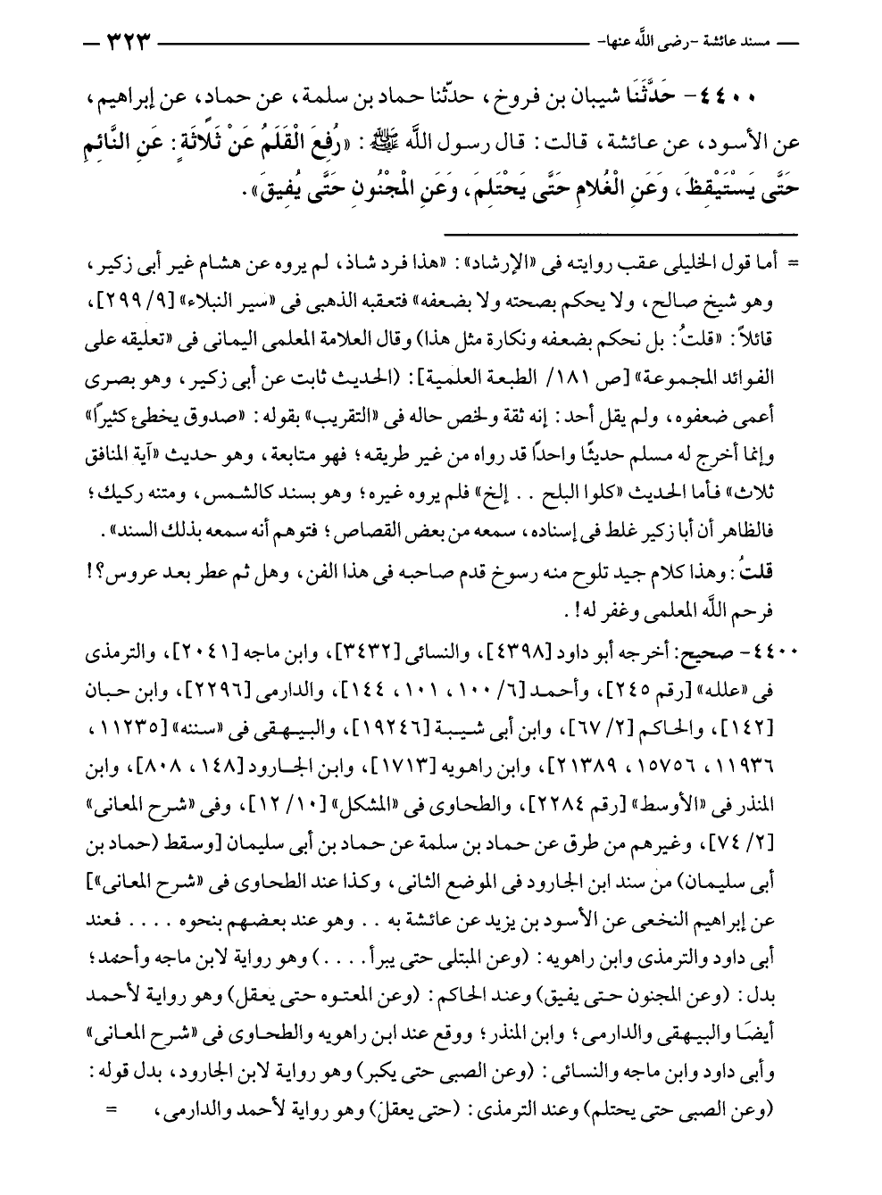 ٤٤٠٠ - حَدَّثَنَا شيبان بن فروخ، حدّثنا حماد بن سلمة، عن حمادٍ، عن إبراهيم، عن الأسود، عن عائشة، قالت: قال رسول الله - صلى الله عليه وسلم -: "رُفِعَ الْقَلَمُ عَنْ ثَلاثَةٍ: عَنِ النَّائِمِ حَتَّى يَسْتَيْقِظَ، وَعَنِ الْغُلامِ حَتَّى يَحْتَلِمَ، وَعَنِ المجْنُونِ حَتَّى يُفِيقَ".