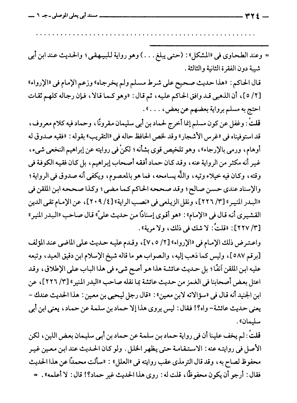قلتُ: وغفل عن كون مسلم إنما أخرج لحماد بن أبى سليمان مقرونًا، وحماد فيه كلام معروف، قد استوفيناه في "غرس الأشجار" وقد لخص الحافظ حاله في "التقريب" بقوله: "فقيه صدوق له أوهام، ورمى بالإرجاء"، وهو تلخيص قوى بشأنه؛ لكن في روايته عن إبراهيم النخعى شئ، غير أنه مكثر من الرواية عنه، وقد كان حماد أفقه أصحاب إبراهيم، بل كان فقيه الكوفة في وقته، وكان فيه خيلاء وتيه، والله يسامحه، فما هو بالمعصوم، ويكفى أنه صدوق في الرواية؛ والإسناد عندى حسن صالح؛ وقد صححه الحاكم كما مضى؛ وكذا صححه ابن الملقن في "البدر المنير" [٣/ ٢٢٦]، ونقل الزيلعى في "نصب الراية" [٤/ ٢٠٩]، عن الإمام تقى الدين القشيرى أنه قال في "الإمام": "هو أقوى إسنادًا من حديث عليّ "قال صاحب "البدر المنير" [٣/ ٢٢٧]: "قلتُ: لا شك في ذلك، ولا مرية".