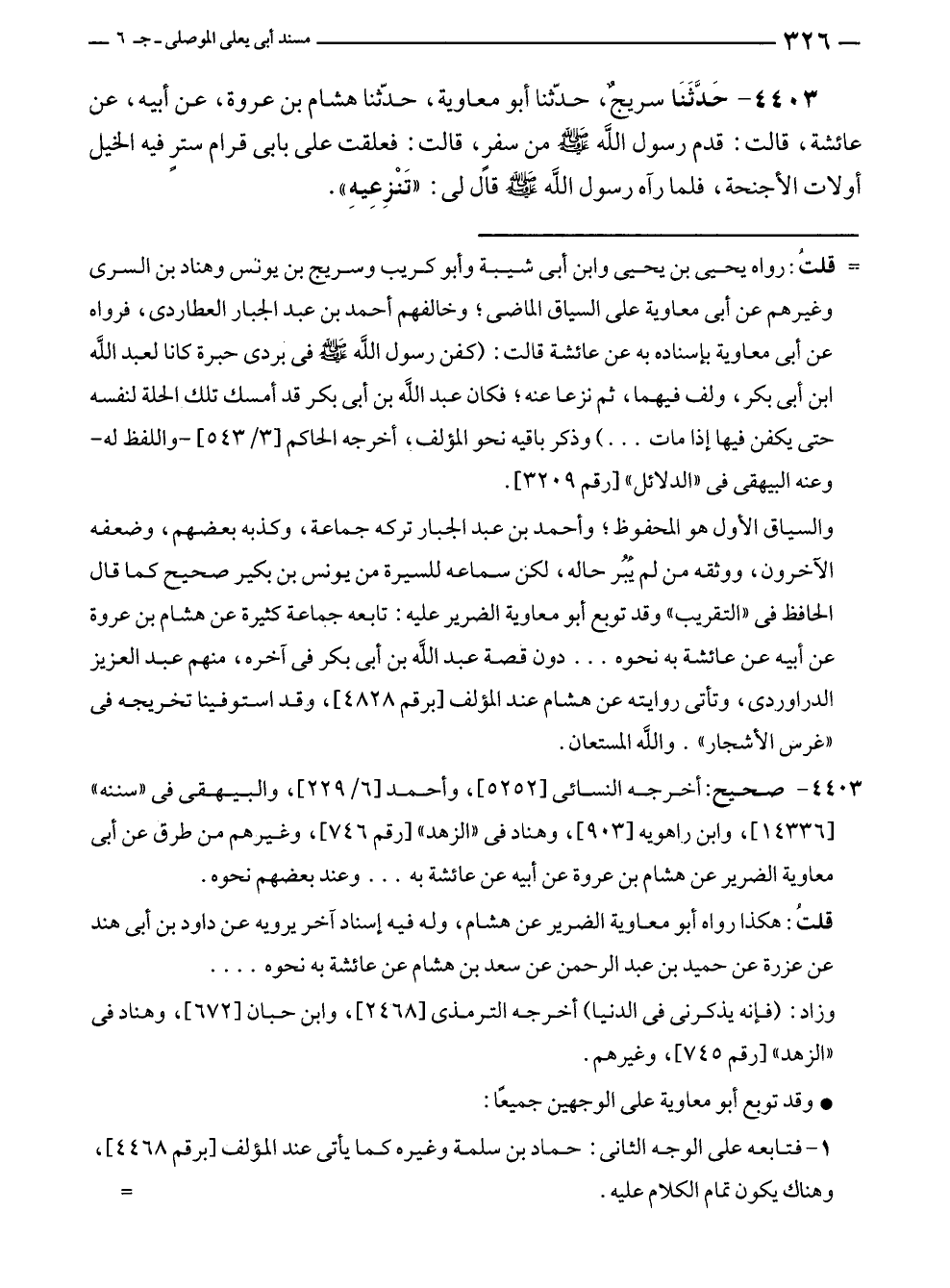 قلتُ: هكذا رواه أبو معاوية الضرير عن هشام، وله فيه إسناد آخر يرويه عن داود بن أبى هند عن عزرة عن حميد بن عبد الرحمن عن سعد بن هشام عن عائشة به نحوه ....