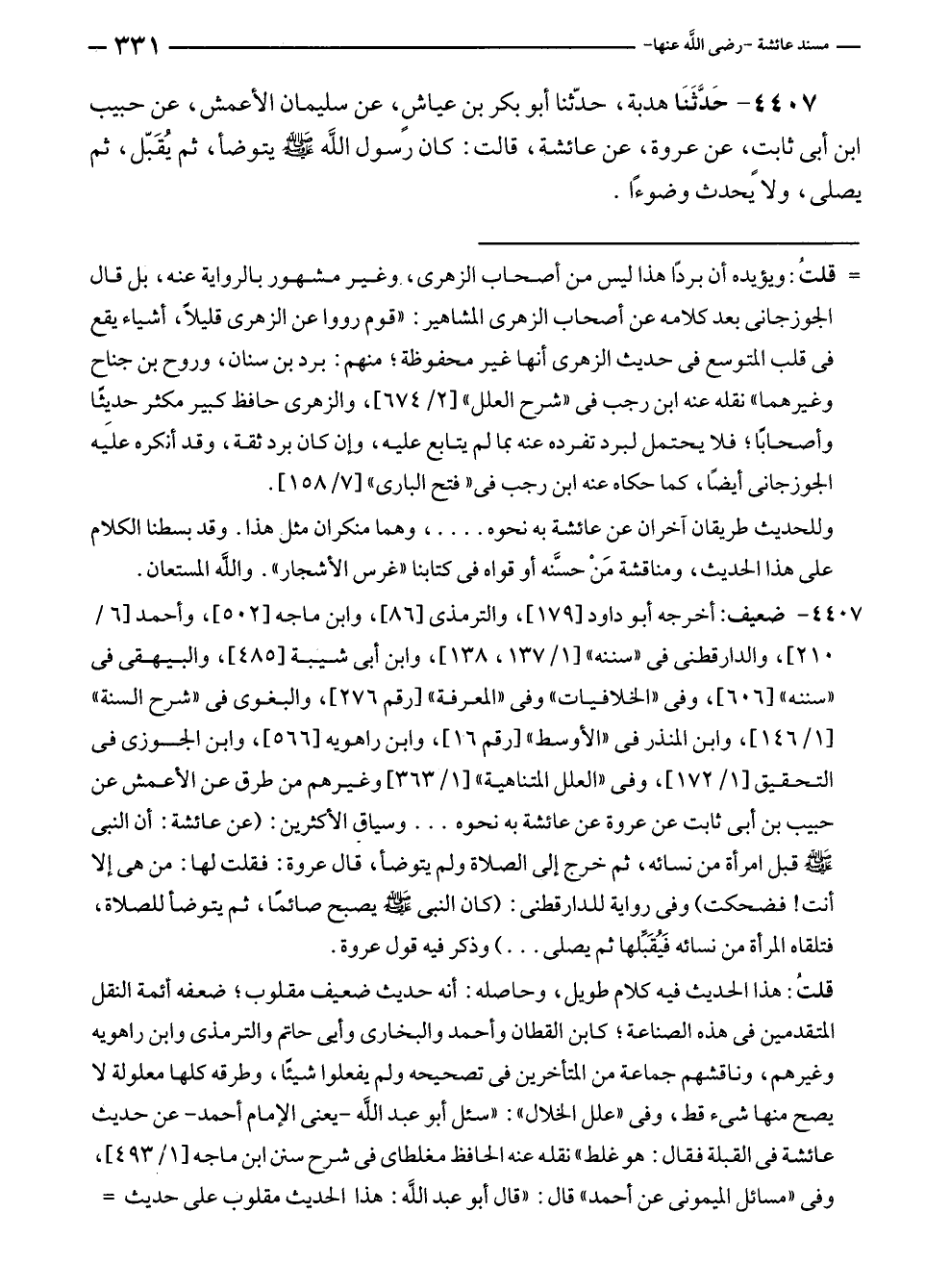 ٤٤٠٧ - حَدَّثَنَا هدبة، حدّثنا أبو بكر بن عياشٍ، عن سليمان الأعمش، عن حبيب بن أبى ثابتٍ، عن عروة، عن عائشة، قالت: كان رسول الله - صلى الله عليه وسلم - يتوضأ، ثم يُقَبّل، ثم يصلى، ولا يحدث وضوءًا.
