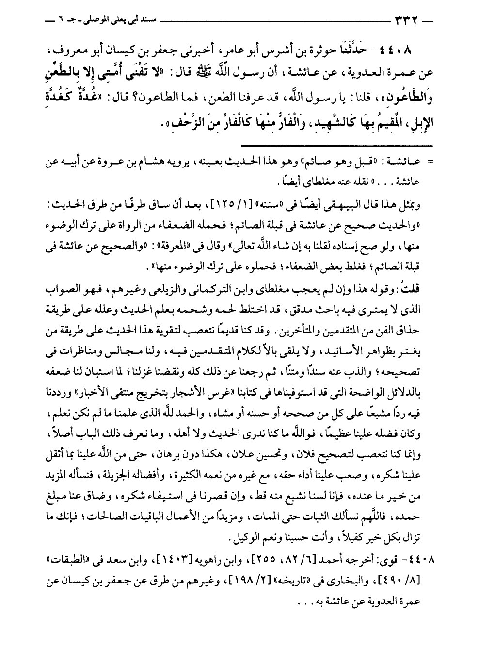 ٤٤٠٨ - حَدَّثَنَا حوثرة بن أشرس أبو عامرٍ، أخبرنى جعفر بن كيسان أبو معروف، عن عمرة العدوية، عن عائشة، أن رسول الله - صلى الله عليه وسلم - قال:"لا تَفْنَى أُمَّتِى إِلا بِالطَّعْنِ وَالطَّاعُونِ"، قلنا: يا رسول الله، قد عرفنا الطعن، فما الطاعون؟ قال:"غُدَّةٌ كغُدَّةِ الإبِلِ، المُقِيمُ بِهَا كالشَّهِيدِ، وَالْفَارُّ مِنْهَا كالْفَارِّ مِنَ الزَّحْفِ".