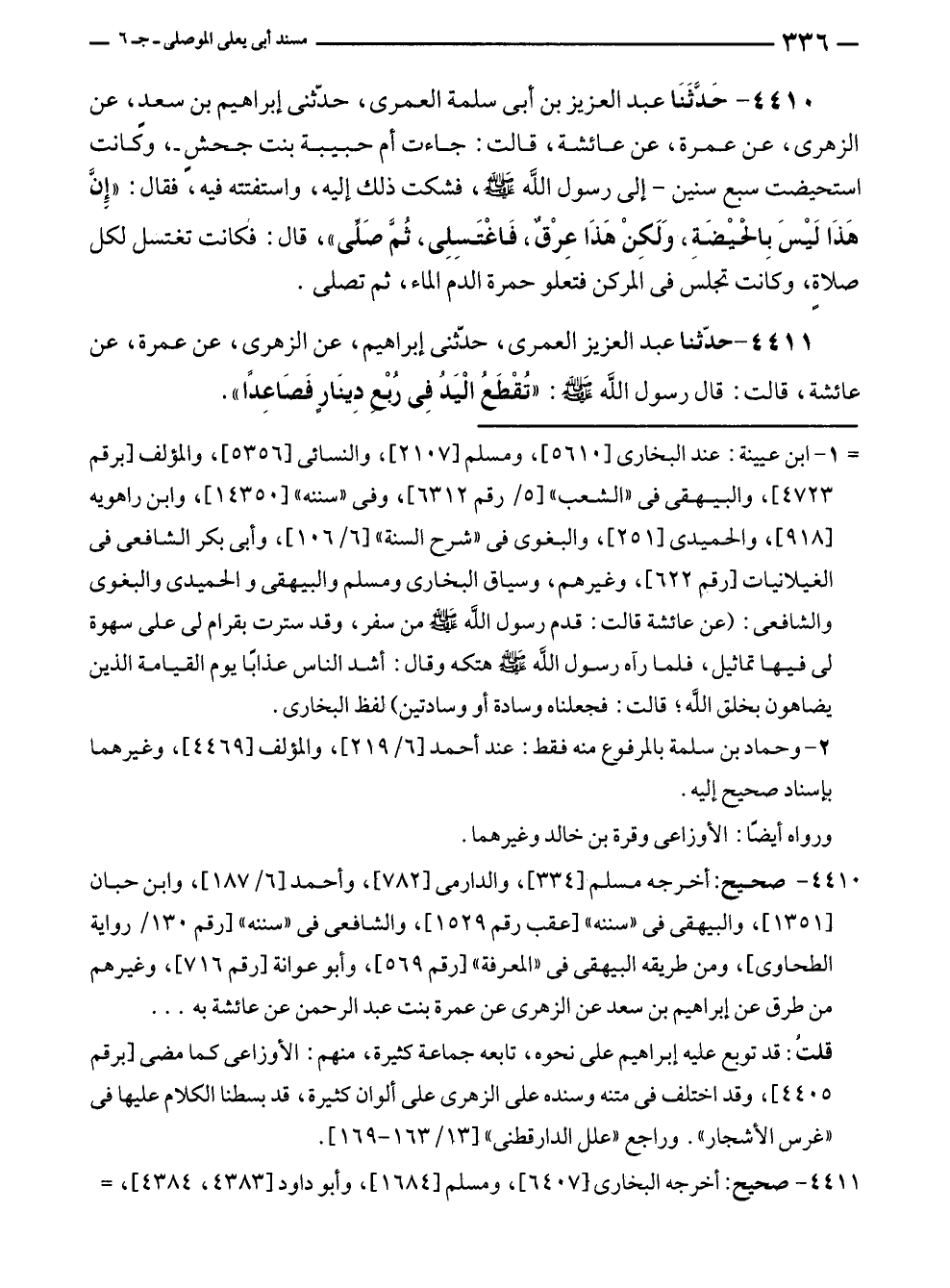 ٤٤١٠ - حَدَّثَنَا عبد العزيز بن أبى سلمة العمرى، حدّثنى إبراهيم بن سعدٍ، عن الزهرى، عن عمرة، عن عائشة، قالت: جاءت أم حبيبة بنت جحشٍ -، وكانت استحيضت سبع سنين - إلى رسول الله - صلى الله عليه وسلم -، فشكت ذلك إليه، واستفتته فيه، فقال: "إِنَّ هَذَا لَيْسَ بِالحيْضَةِ، وَلَكِنْ هَذَا عِرْقٌ، فَاغْتَسِلِى، ثُمَّ صَلِّى"، قال: فكانت تغتسل لكل صلاة، وكانت تجلس في المركن فتعلو حمرة الدم الماء، ثم تصلى.