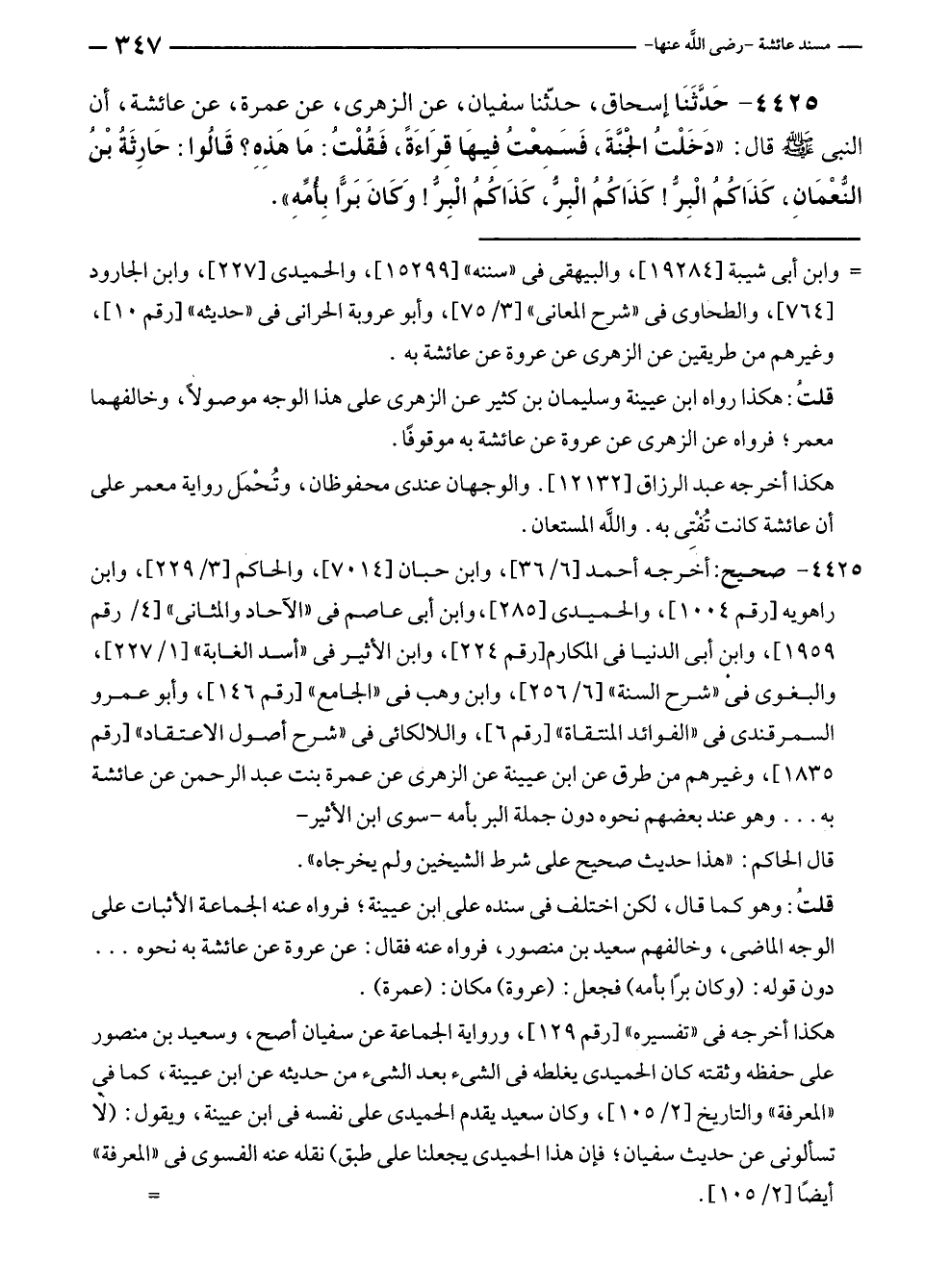 ٤٤٢٥ - حَدَّثَنَا إسحاق، حدّثنا سفيان، عن الزهرى، عن عمرة، عن عائشة، أن النبي - صلى الله عليه وسلم - قال: "دَخَلْتُ الجَنَّةَ، فَسَمِعْتُ فِيهَا قِرَاءَةً، فَقُلْتُ: مَا هَذِهِ؟ قَالُوا: حَارِثَةُ بْنُ النُّعْمَانِ، كَذَاكُمُ الْبِرُّ! كَذَاكُمُ الْبِرُّ، كَذَاكُمُ الْبِرُّ! وَكَانَ بَرًّا بِأُمِّهِ".