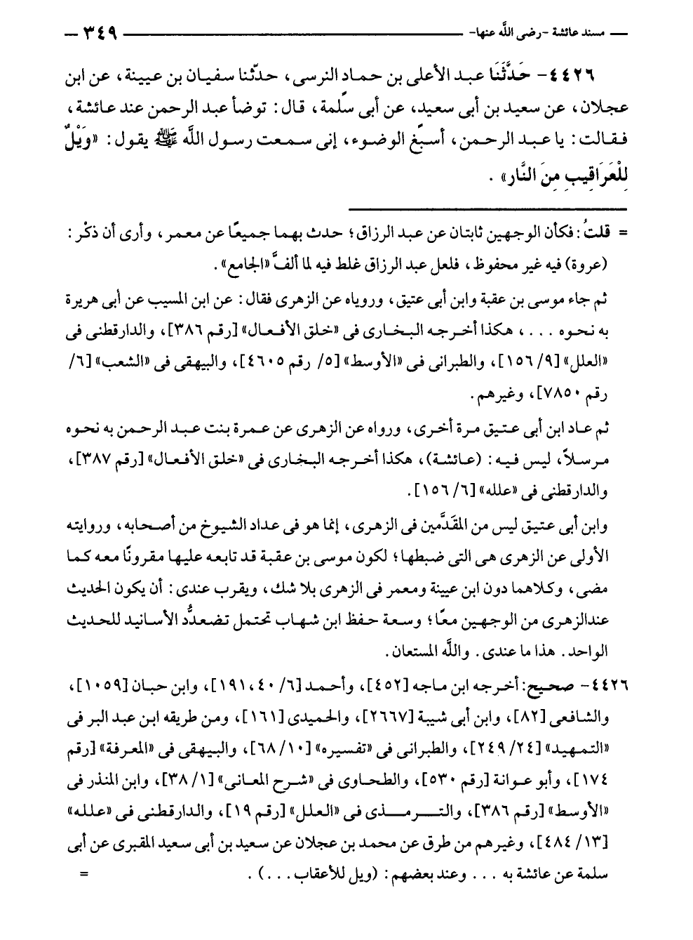 ٤٤٢٦ - حَدَّثَنَا عبد الأعلى بن حمادٍ النرسى، حدّثنا سفيان بن عيينة، عن ابن عجلان، عن سعيد بن أبى سعيد، عن أبى سلمة، قال: توضأ عبد الرحمن عند عائشة، فقالت: يا عبد الرحمن، أسبغ الوضوء، إنى سمعت رسول الله - صلى الله عليه وسلم - يقول: "وَيْلٌ لِلْعَرَاقِيبِ مِنَ النَّار".
