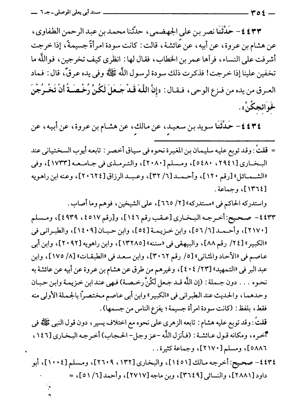 ٤٤٣٣ - صحيح: أخرجه البخارى [عقب رقم ١٤٦]، و [رقم ٤٥١٧، ٤٩٣٩]، ومسلم [٢١٧٠]، وأحمد [٦/ ٥٦]، وابن خزيمة [٥٤]، وابن حبان [١٤٠٩]، والطبرانى في "الكبير" [٢٤/ رقم ٨٨]، والبيهقى في "سننه" [١٣٢٨٥]، وابن راهويه [٢٠٩٢]، وابن أبى عاصم في "الآحاد والمثانى" [٥/ رقم ٣٠٦٢]، وابن سعد في "الطبقات" [٨/ ١٧٥]، وابن عبد البر في "التمهيد" [٢٣/ ٤٠٤]، وغيرهم من طرق عن هشام بن عروة عن أبيه عن عائشة به نحوه ... دون جملة: (إن الله قد جعل لَكُنَّ رخصة) فهى عند ابن خزيمة وابن حبان وحدهما، والحديث عند الطبراني في "الكبير" وابن أبى عاصم مختصرًا بالجملة الأولى منه فقط، بلفظ: (كانت سودة امرأة جسيمة؛ يفزع الناس من جسمها).