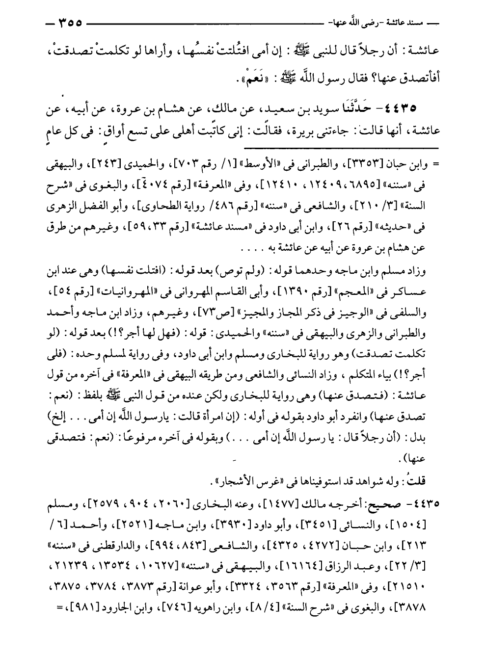 ٤٤٣٥ - صحيح: أخرجه مالك [١٤٧٧]، وعنه البخارى [٢٠٦٠، ٩٠٤، ٢٥٧٩]، ومسلم [١٥٠٤]، والنسائى [٢٤٥١]، وأبو داود [٣٩٣٠]، وابن ماجه [٢٥٢١]، وأحمد [٦/ ٢١٣]، وابن حبان [٤٢٧٢، ٤٣٢٥]، والشافعى [٨٤٣، ٩٩٤]، والدارقطنى في "سننه" [٣/ ٢٢]، وعبد الرزاق [١٦١٦٤]، والبيهقى في "سننه" [١٠٦٢٧، ١٣٥٣٤، ٢١٢٣٩، ٢١٥١٠]، وفى "المعرفة" [رقم ٣٥٦٣، ٣٣٢٤]، وأبو عوانة [رقم ٣٨٧٣، ٣٧٨٤، ٣٨٧٥، ٣٨٧٨]، والبغوى في "شرح السنة" [٤/ ٨]، وابن راهويه [٧٤٦]، وابن الجارود [٩٨١]، =