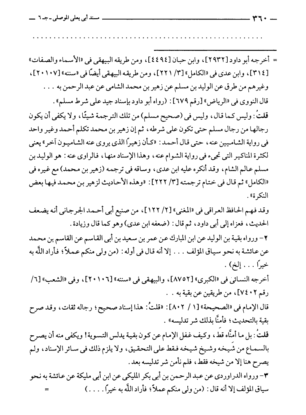 قلتُ: بل ما أمِنَّاه قط، وكيف غفل الإمام عن كون بقية يدلس التسوية! ويكفى منه أن يصرح بالسماع من شيخه وشيخ شيخه فقط على التحقيق، ولا يلزم ذلك في سائر الإسناد، ولم يصرح هنا إلا من شيخه فقط، فلم نأمن شر تدليسه بعد.