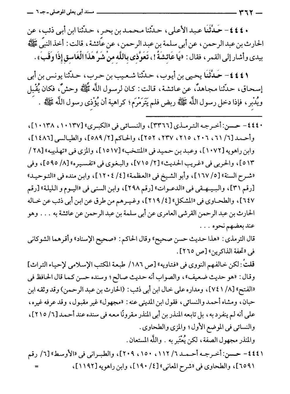 ٤٤٤٠ - حسن: أخرجه الترمذى [٣٣٦٦]، والنسائى في "الكبرى" [١٠١٣٧، ١٠١٣٨]، وأحمد [٦/ ٦١، ٢٠٦، ٢١٥، ٢٣٧، ٢٥٢]، والحاكم [٢/ ٥٨٩]، والطيالسى [١٤٨٦]، وابن راهويه [١٠٧٢]، وعبد بن حميد في "المنتخب" [١٥١٧]، والمزى في "تهذيبه" [٢٨/ ٥١٣]، والحربى في "غريب الحديث" [٢/ ٧١٥]، والبغوى في "تفسيره" [٨/ ٥٩٥]، وفى "شرح السنة" [٥/ ١٦٧]، وأبو الشيخ في "العظمة" [٤/ ١٢٠٤]، وابن منده في "التوحيد" [رقم ٣١]، والبيهقى في "الدعوات" [رقم ٢٩٨]، وابن السنى في "اليوم والليلة" [رقم ٦٤٧]، والطحاوى في "المشكل" [٤/ ٢١٩]، وغيرهم من طرق عن ابن أبى ذئب عن خاله الحارث بن عبد الرحمن القرشى العامرى عن أبى سلمة بن عبد الرحمن عن عائشة به ... وهو عند بعضهم نحوه ...