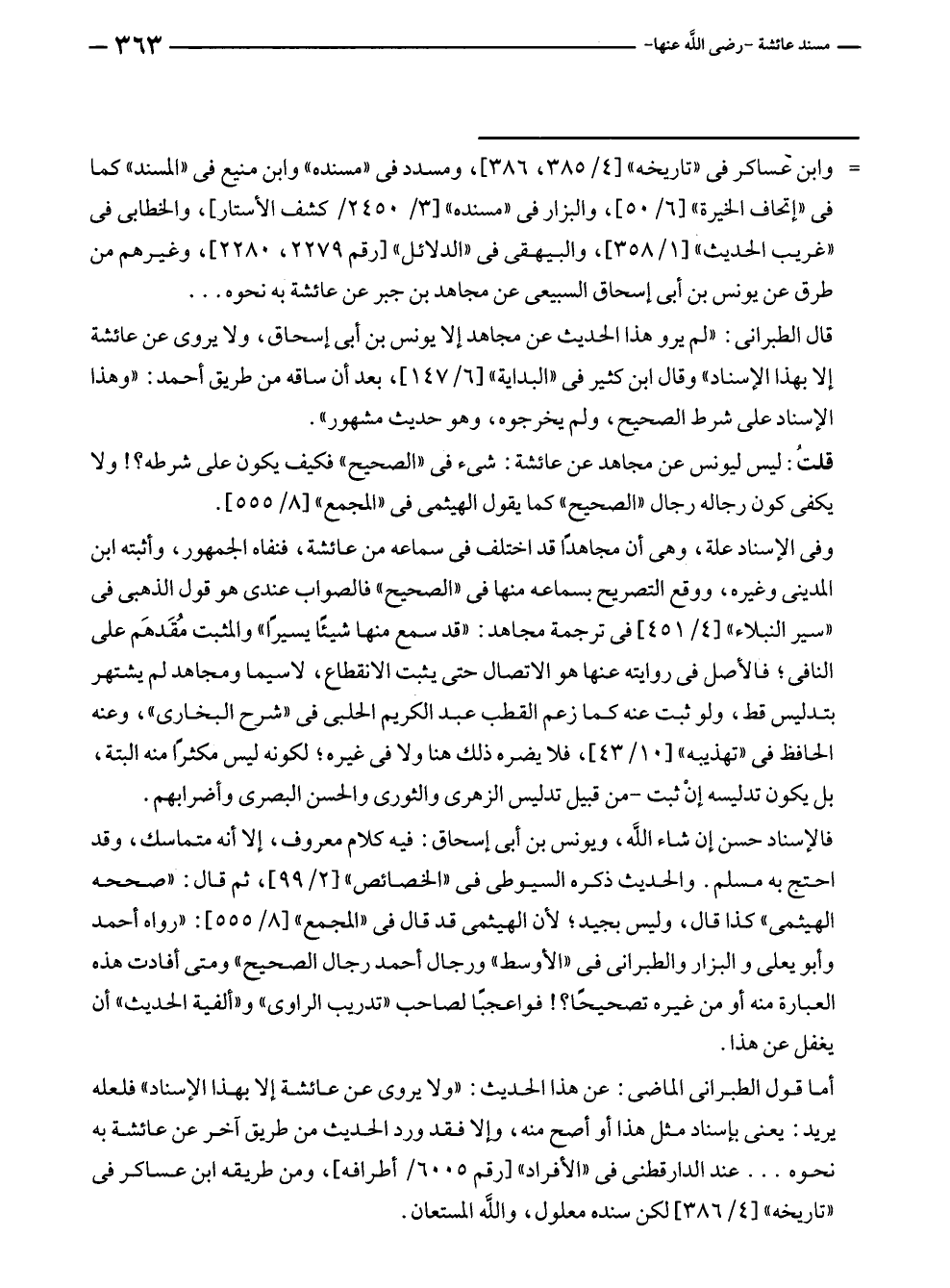 وفى الإسناد علة، وهى أن مجاهدًا قد اختلف في سماعه من عائشة، فنفاه الجمهور، وأثبته ابن المدينى وغيره، ووقع التصريح بسماعه منها في "الصحيح" فالصواب عندى هو قول الذهبى في "سير النبلاء" [٤/ ٤٥١] في ترجمة مجاهد: "قد سمع منها شيئًا يسيرًا" والمثبت مُقَدَّم على النافى؛ فالأصل في روايته عنها هو الاتصال حتى يثبت الانقطاع، لاسيما ومجاهد لم يشتهر بتدليس قط، ولو ثبت عنه كما زعم القطب عبد الكريم الحلبى في "شرح البخارى"، وعنه الحافظ في "تهذيبه" [١٠/ ٤٣]، فلا يضره ذلك هنا ولا في غيره؛ لكونه ليس مكثرًا منه البتة، بل يكون تدليسه إنْ ثبت - من قبيل تدليس الزهرى والثورى والحسن البصرى وأضرابهم.