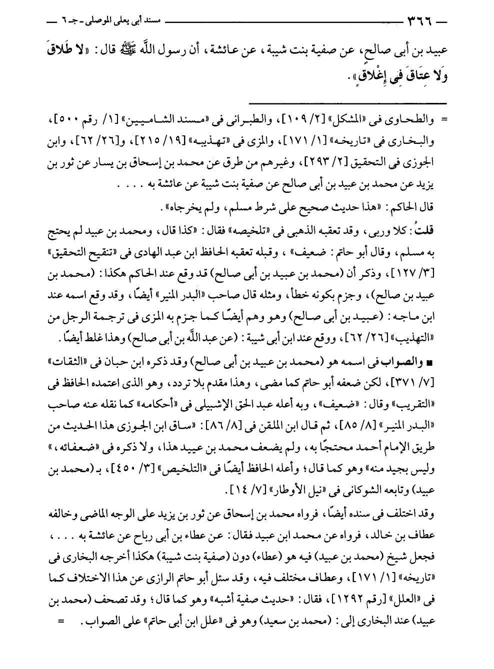 * والصواب في اسمه هو (محمد بن عبيد بن أبى صالح) وقد ذكره ابن حبان في "الثقات" [٧/ ٣٧١]، لكن ضعفه أبو حاتم كما مضى، وهذا مقدم بلا تردد، وهو الذي اعتمده الحافظ في "التقريب" وقال: "ضعيف"، وبه أعله عبد الحق الإشبيلى في "أحكامه" كما نقله عنه صاحب "البدر المنير" [٨/ ٨٥]، ثم قال ابن الملقن في [٨/ ٨٦]: "ساق ابن الجوزى هذا الحديث من طريق الإمام أحمد محتجًا به، ولم يضعف محمد بن عييد هذا، ولا ذكره في "ضعفائه، وليس بجيد منه" وهو كما قال؛ وأعله الحافظ أيضًا في "التلخيص" [٣/ ٤٥٠]، بـ (محمد بن عبيد) وتابعه الشوكانى في "نيل الأوطار" [٧/ ١٤].