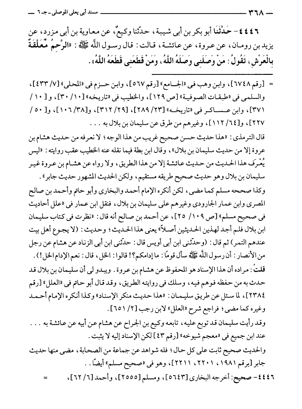 ٤٤٤٦ - حَدَّثَنَا أبو بكر بن أبى شيبة، حدّثنا وكيعٌ، عن معاوية بن أبى مزرد، عن يزيد بن رومان، عن عروة، عن عائشة، قالت: قال رسول الله - صلى الله عليه وسلم -: "الرَّحِمُ معَلَّقَةٌ بِالْعَرْشِ، تَقُولُ: مَنْ وَصَلَنِى وَصَلَهُ اللَّهُ، وَمَنْ قَطَعَنِى قَطَعَهُ اللهُ".