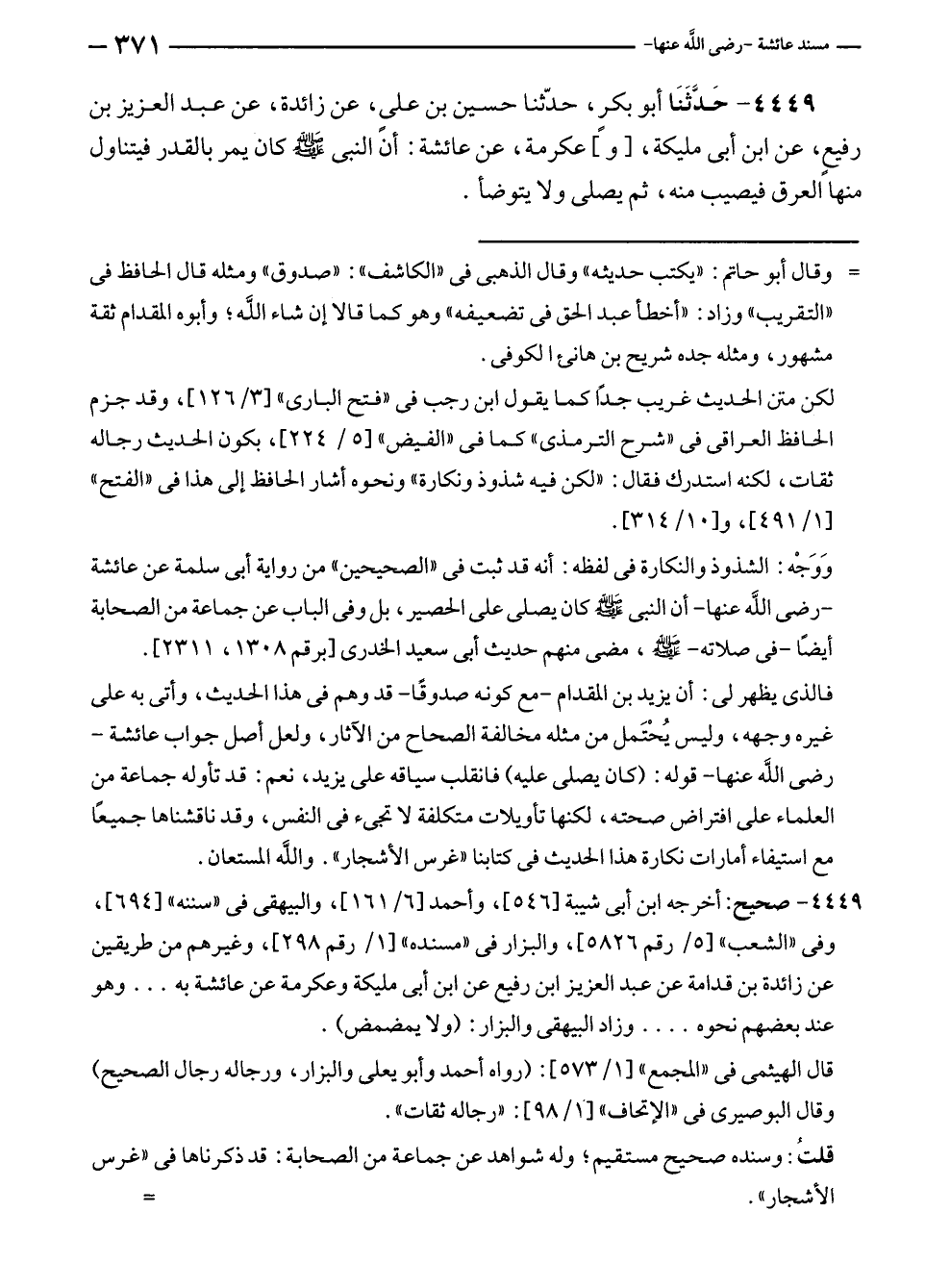 ٤٤٤٩ - حَدَّثَنَا أبو بكر، حدّثنا حسين بن علي، عن زائدة، عن عبد العزيز بن رفيعٍ، عن ابن أبى مليكة، [و] عكرمة، عن عائشة: أن النبي - صلى الله عليه وسلم - كان يمر بالقدر فيتناول منها العرق فيصيب منه، ثم يصلى ولا يتوضأ.