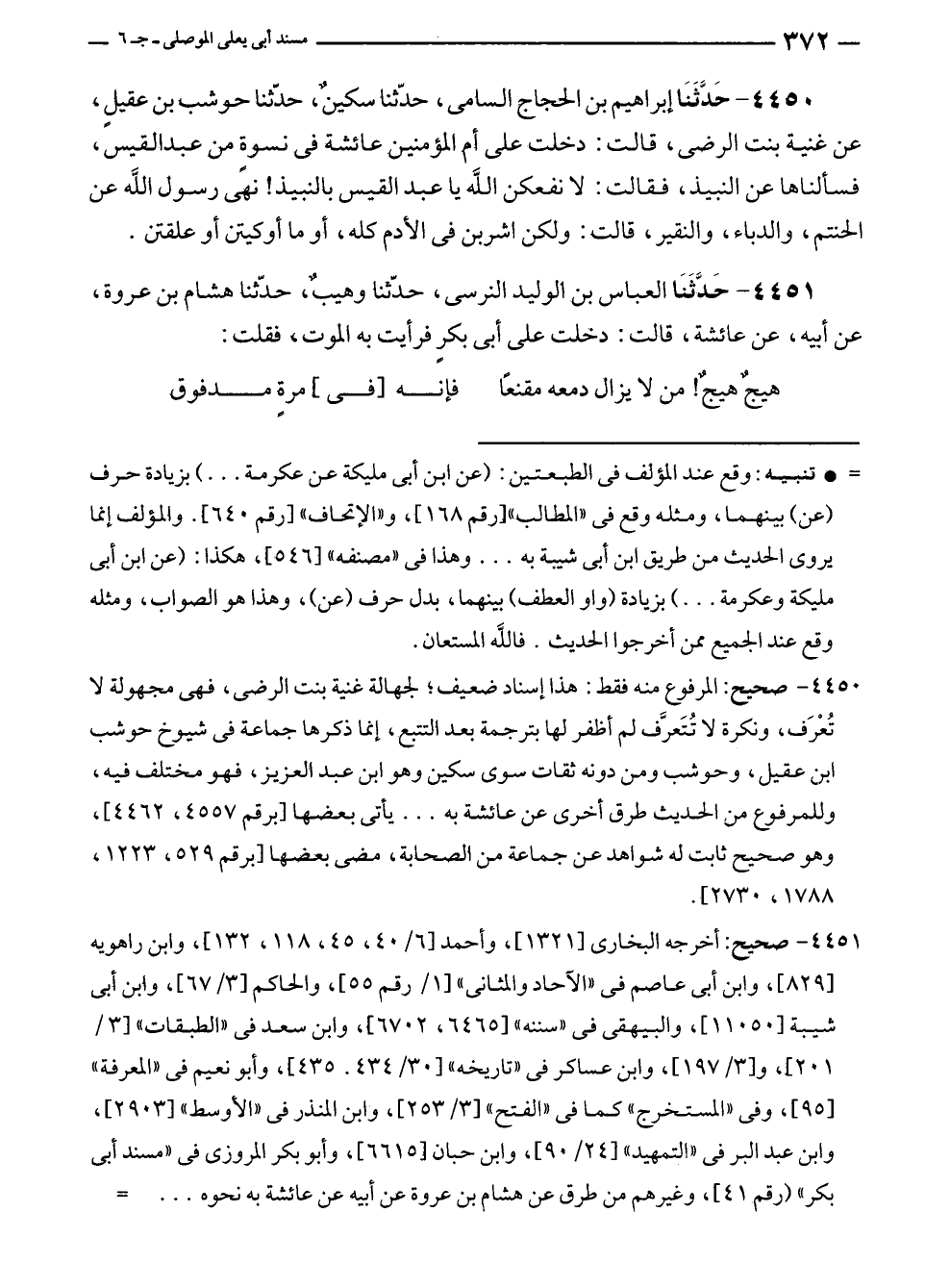 ٤٤٥٠ - صحيح: المرفوع منه فقط: هذا إسناد ضعيف؛ لجهالة غنية بنت الرضى، فهى مجهولة لا تُعْرَف، ونكرة لا تُتَعرَّف لم أظفر لها بترجمة بعد التتبع، إنما ذكرها جماعة في شيوخ حوشب ابن عقيل، وحوشب ومن دونه ثقات سوى سكين وهو ابن عبد العزيز، فهو مختلف فيه، وللمرفوع من الحديث طرق أخرى عن عائشة به. . . يأتى بعضها [برقم ٤٥٥٧، ٤٤٦٢]، وهو صحيح ثابت له شواهد عن جماعة من الصحابة، مضى بعضها [برقم ٥٢٩، ١٢٢٣، ١٧٨٨، ٢٧٣٠].