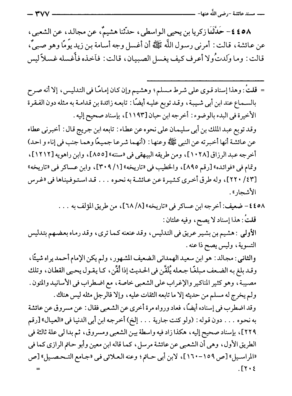 ٤٤٥٨ - حَدَّثَنَا زكريا بن يحيى الواسطى، حدّثنا هشيمٌ، عن مجالد، عن الشعبى، عن عائشة، قالت: أمرنى رسول الله - صلى الله عليه وسلم - أن أغسل وجه أسامة بن زيد يومًا وهو صبىٌ، قالت: وما وَلدتُ ولا أعرف كيف يغسل الصبيان، قالت: فآخذه فأغسله غسلًا ليس