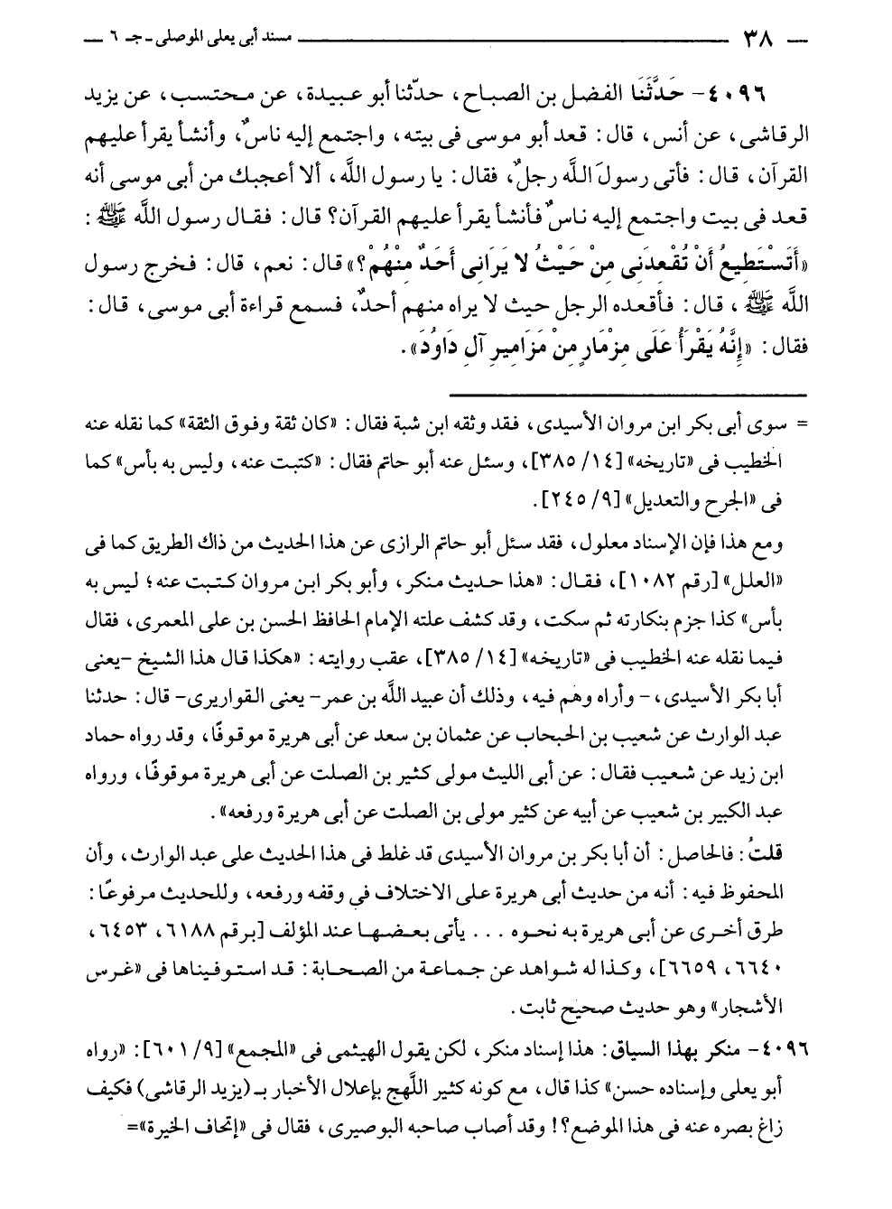 ٤٠٩٦ - حَدَّثَنَا الفضل بن الصباح، حدّثنا أبو عبيدة، عن محتسب، عن يزيد الرقاشي، عن أنس، قال: قعد أبو موسى في بيته، واجتمع إليه ناسٌ، وأنشأ يقرأ عليهم القرآن، قال: فأتى رسولَ الله رجلٌ، فقال: يا رسول الله، ألا أعجبك من أبي موسى أنه قعد في بيت واجتمع إليه ناسٌ فأنشأ يقرأ عليهم القرآن؟ قال: فقال رسول الله - صلى الله عليه وسلم -: "أَتَسْتَطِيعُ أَنْ تُقْعدَنِى مِنْ حَيْث لا يَرَانِى أَحَدٌ مِنْهُمْ؟ " قال: نعم، قال: فخرج رسول الله - صلى الله عليه وسلم -، قال: فأَقعده الرجل حيث لا يراه منهم أحدٌ، فسمع قراءة أبي موسى، قال: فقال: "إِنَّه يَقْرَأ - عَلَى مِزْمَارٍ مِنْ مَزَامِيرِ آلِ دَاوُدَ".