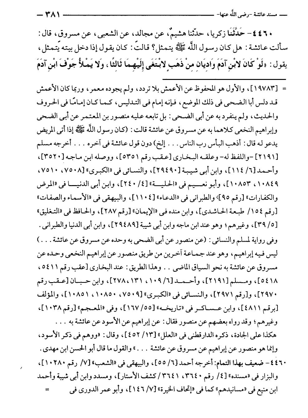 = [١٩٧٨٣]، والأول هو المحفوظ عن الأعمش بلا تردد، ولم يجوده معمر، وربما كان الأعمش قد دلس أبا الضحى في ذلك الموضع، فإنه إمام في التدليس، كما كان إمامًا في الحروف والحديث، ولم ينفرد به عن أبى الضحى: بل تابعه عليه منصور بن المعتمر عن أبى الضحى وإبراهيم النخعى كلاهما به عن مسروق عن عائشة قالت: (كان رسول الله - صلى الله عليه وسلم - إذا أتى المريض يدعو له قال: أذهب الباس رب الناس. . . إلخ) دون قول عائشة في آخره. . . أخرجه مسلم [٢١٩١]- واللفظ له - وعلقه البخارى [عقب رقم ٥٣٥١]، ووصله ابن ماجه [٣٥٢٠]، وأحمد [٦/ ١١٤]، وابن أبى شيبة [٢٩٤٩٠]، والنسائى في "الكبرى" [٧٥٠٨، ٧٥١٠، ١٠٨٤٩، ١٠٨٥٣]، وأبو نعيم في "الحلية" [٤/ ٢٤٠]، وابن أبى الدنيا في "المرض والكفارات" [رقم ٩٥] , والطبرانى في "الدعاء" [١١٠٤]، والبيهقى في "الأسماء والصفات" [رقم ١٥٤/ طبعة الحاشدى]، وابن منده في "الإيمان" [رقم ٢٨٧]، والحافظ في "التغليق" [٥/ ٣٩]، وغيرهم؛ وهو عند ابن ماجه وابن أبى شيبة [٢٩٤٨٩]، وابن أبى الدنيا والطبرانى.