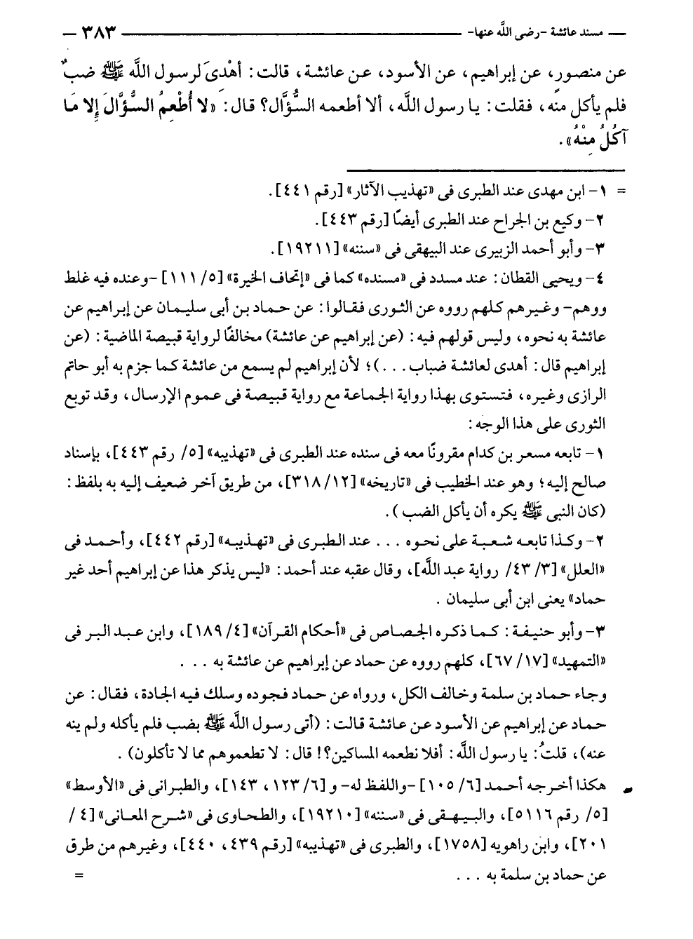 وجاء حماد بن سلمة وخالف الكل، ورواه عن حماد فجوده وسلك فيه الجادة، فقال: عن حماد عن إبراهيم عن الأسود عن عائشة قالت: (أتى رسول الله - صلى الله عليه وسلم - بضب فلم يأكله ولم ينه عنه)، قلتُ: يا رسول الله: أفلا نطعمه المساكين؟! قال: لا تطعموهم مما لا تأكلون).