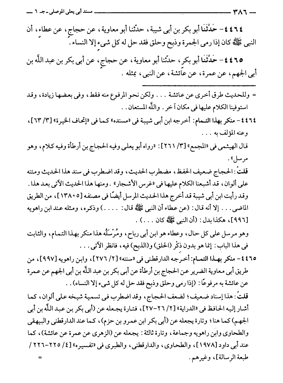 ٤٤٦٥ - منكر بهذا التمام: أخرجه الدارقطنى في "سننه" [٢/ ٢٧٦]، وابن راهويه [٩٩٧]، من طريق أبى معاوية الضرير عن الحجاج بن أرطأة عن أبى بكر بن عبد الله بن أبى الجهم عن عمرة عن عائشة به مرفوعًا: (إذا رمى وحلق وذبح فقد حل له كل شئ إلا النساء). .
