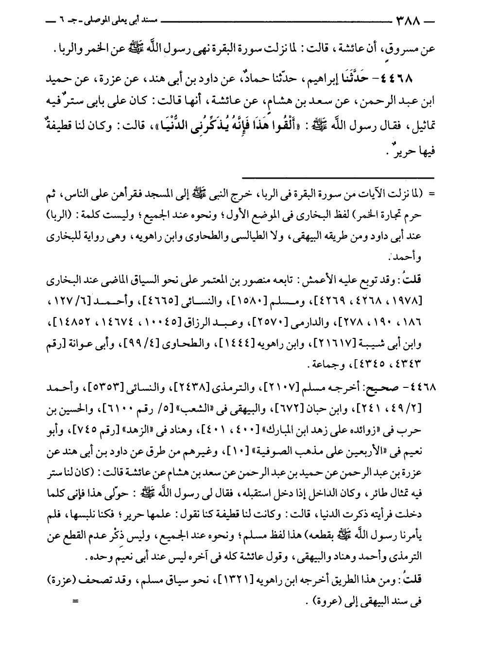 ٤٤٦٨ - صحيح: أخرجه مسلم [٢١٠٧]، والترمذى [٢٤٣٨]، والنسائى [٥٣٥٣]، وأحمد [٢/ ٤٩، ٢٤١]، وابن حبان [٦٧٢]، والبيهقى في "الشعب" [٥/ رقم ٦١٠٠]، والحسين بن حرب في "زوائده على زهد ابن المبارك" [٤٠٠، ٤٠١]، وهناد في "الزهد" [رقم ٧٤٥]، وأبو نعيم في "الأربعين على مذهب الصوفية" [١٠]، وغيرهم من طرق عن داود بن أبى هند عن عزرة بن عبد الرحمن عن حميد بن عبد الرحمن عن سعد بن هشام عن عائشة قالت: (كان لنا ستر فيه تمثال طائر، وكان الداخل إذا دخل استقبله، فقال لى رسول الله - صلى الله عليه وسلم -: حوّلى هذا فإنى كلما دخلت فرأيته ذكرت الدنيا، قالت: وكانت لنا قطيفة كنا نقول: علمها حرير؛ فكنا نلبسها، فلم يأمرنا رسول الله - صلى الله عليه وسلم - بقطعه) هذا لفظ مسلم؛ ونحوه عند الجميع، وليس ذِكْر عدم القطع عن الترمذى وأحمد وهناد والبيهقى، وقول عائشة كله في آخره ليس عند أبى نعيم وحده.