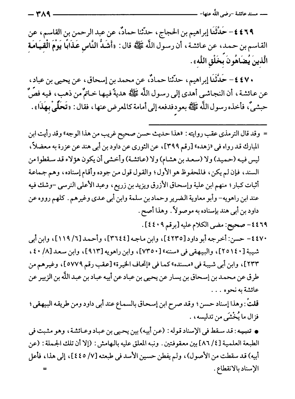 ٤٤٦٩ - حَدَّثَنَا إبراهيم بن الحجاج، حدّثنا حمادٌ، عن عبد الرحمن بن القاسم، عن الفاسم بن حمد، عن عائشة، أن رسول الله - صلى الله عليه وسلم - قال: "أَشَدُّ النَّاسِ عَذَابًا يَوْمَ الْقِيَامَةِ الَّذِينَ يُضَاهُونَ بِخَلْقِ اللهِ".