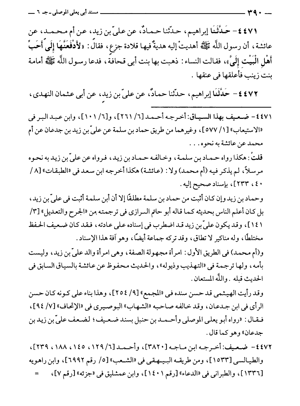 ٤٤٧١ - حَدَّثَنَا إبراهيم، حدّثنا حمادٌ، عن عليّ بن زيدٍ، عن أم محمدٍ، عن عائشة، أن رسول الله - صلى الله عليه وسلم - أهديتْ إليه هديةٌ فيها قلادة جزعٍ، فقال: "لأَدْفَعَنَّهَا إِلَى أَحَبِّ أَهْلِ الْبَيْتِ إِلَيَّ"، فقالت النساء: ذهبت بها بنت أبى قحافة، فدعا رسول الله - صلى الله عليه وسلم - أمامة بنت زينب فأعلقها في عنقها.