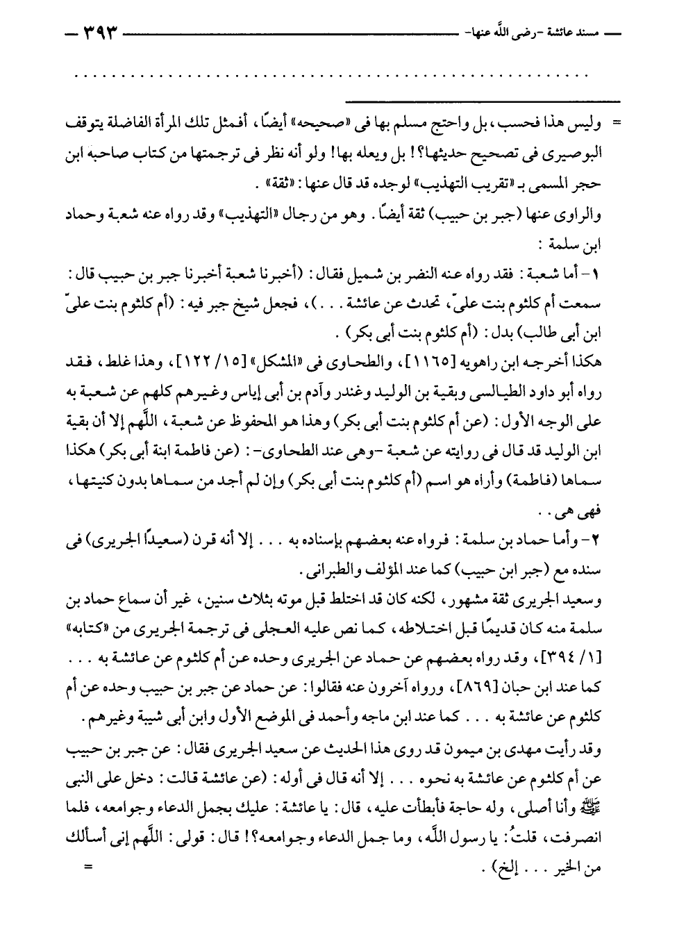 وسعيد الجريرى ثقة مشهور، لكنه كان قد اختلط قبل موته بثلاث سنين، غير أن سماع حماد بن سلمة منه كان قديمًا قبل اختلاطه، كما نص عليه العجلى في ترجمة الجريرى من "كتابه" [١/ ٣٩٤]، وقد رواه بعضهم عن حماد عن الجريرى وحده عن أم كلثوم عن عائشة به. . .