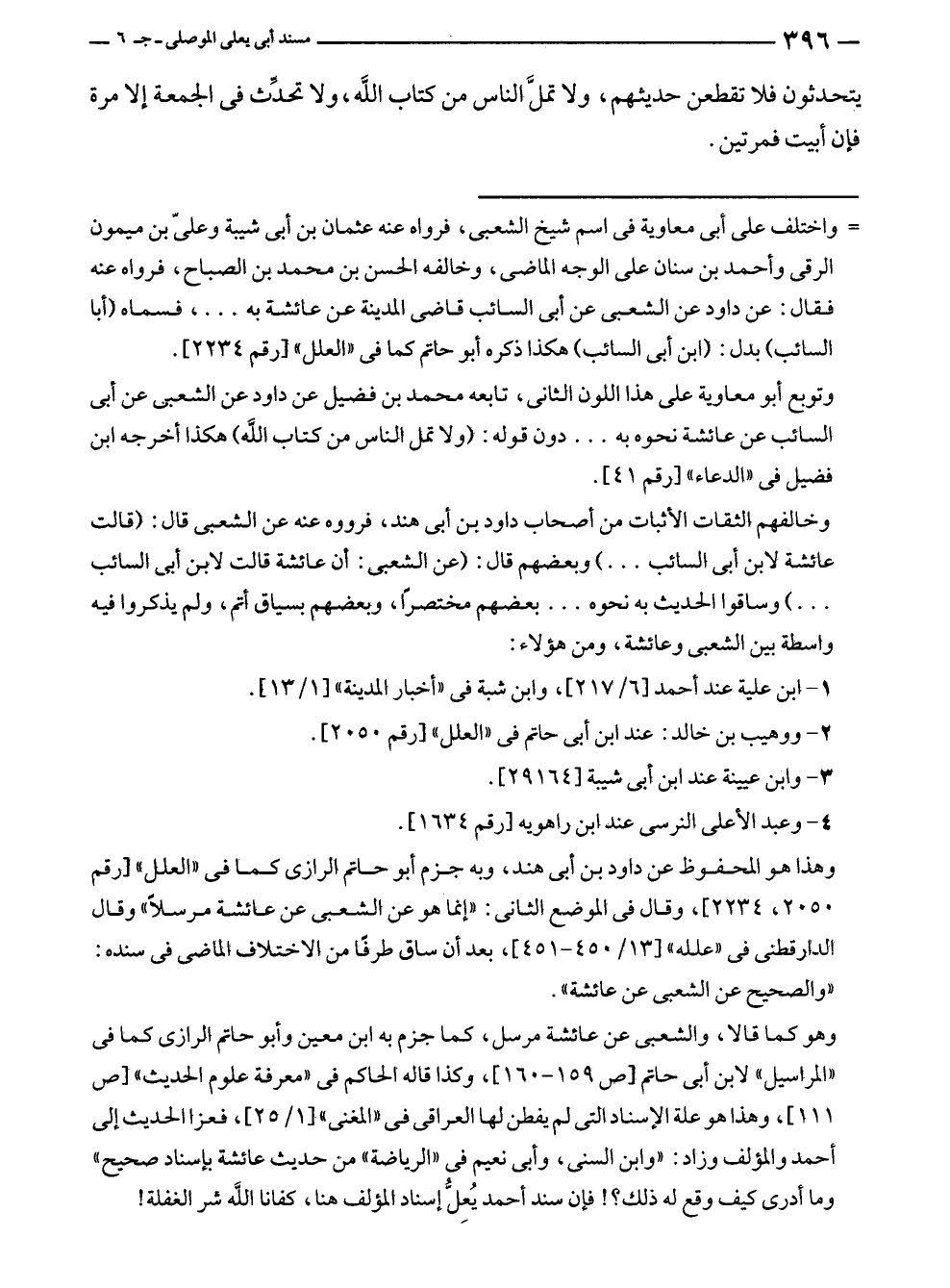 وخالفهم الثقات الأثبات من أصحاب داود بن أبى هند، فرووه عنه عن الشعبى قال: (قالت عائشة لابن أبى السائب. . .) وبعضهم قال: (عن الشعبى: أن عائشة قالت لابن أبى السائب. . .) وساقوا الحديث به نحوه. . . بعضهم مختصرًا، وبعضهم بسياق أتم، ولم يذكروا فيه واسطة بين الشعبى وعائشة، ومن هؤلاء: