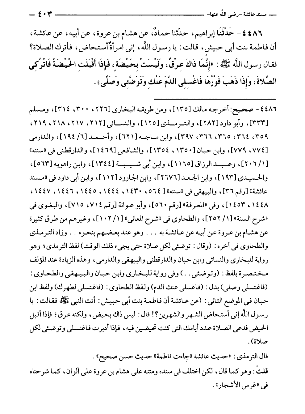 ٤٤٨٦ - صحيح: أخرجه مالك [١٣٥]، ومن طريقه البخارى [٢٢٦، ٣٠٠، ٣١٤]، ومسلم [٣٣٣]، وأبو داود [٢٨٢]، والترمذى [١٢٥]، والنسائى [٢١٢، ٢١٧، ٢١٨، ٢١٩، ٣٥٩، ٣٦٤، ٣٦٥، ٣٦٦، ٣٩٧]، وابن ماجه [٦٢١]، وأحمد [٦/ ١٩٤]، والدارمى [٧٧٤، ٧٧٩]، وابن حبان [١٣٥٠، ١٣٥٤]، والشافعى [١٤٦٩]، والدارقطنى في "سننه" [١/ ٢٠٦]، وعبد الرزاق [١١٦٥]، وابن أبى شيبة [١٣٤٤]، وابن راهويه [٥٦٣]، والحميدى [١٩٣]، وابن الجعد [٢٦٧٦]، وابن الجارود [١١٢]، وابن أبى داود في "مسند عائشة" [رقم ٣٦]، والبيهقى في "سننه" [٥٦٤، ١٤٣٠، ١٤٤٤، ١٤٤٥، ١٤٤٦، ١٤٤٧، ١٤٤٨، ١٤٥٣]، وفى "المعرفة" [رقم ٥٦٠]، وأبو عوانة [رقم ٧١٤، ٧١٥]، والبغوى في "شرح السنة" [١/ ٢٥٢]، والطحاوى في "شرح المعانى" [١/ ١٥٢]، وغيرهم من طرق كثيرة عن هشام بن عروة عن أبيه عن عائشة به. . . وهو عند بعضهم بنحوه. . وزاد الترمذى والطحاوى في آخره: (وقال: توضئى لكل صلاة حتى يجئ ذلك الوقت) لفظ الترمذى؛ وهو رواية للبخارى والنسائى وابن حبان والدارقطنى والبيهقى والدارمى، وهذه الزيادة عند المؤلف مختصرة بلفظ: (وتوضئى. .) وفى رواية للبخارى وابن حبان والبيهقى والطحاوى: (فاغتسلى وصلى) بدل: (فاغسلى عنك الدم) ولفظ الطحاوى: (فاغتسلى لطهرك) ولفظ ابن حبان في الموضع الثاني: (عن عائشة أن فاطمة بنت أبى حبيش: أتت النبي - صلى الله عليه وسلم - فقالت: يا رسول الله إنى أستحاض الشهر والشهرين؟! قال: ليس ذاك بحيض، ولكنه عرق؛ فإذا أقبل الحيض فدعى الصلاة عدد أيامك التى كنت تحيضين فيه، فإذا أدبرت فاغتسلى وتوضئى لكل صلاة).