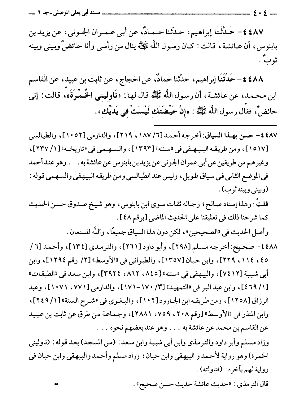 ٤٤٨٨ - حَدَّثَنَا إبراهيم، حدّثنا حمادٌ، عن الحجاج، عن ثابت بن عبيد، عن القاسم بن محمدٍ، عن عائشة، أن رسول الله - صلى الله عليه وسلم - قال لها: "نَاوِلِينِى الْخمْرَةَ"، قالت: إنى حائضٌ، فقال رسول الله - صلى الله عليه وسلم -: "إِنَّ حَيْضَتَكِ لَيْسَتْ فِي يَدَيْكِ".