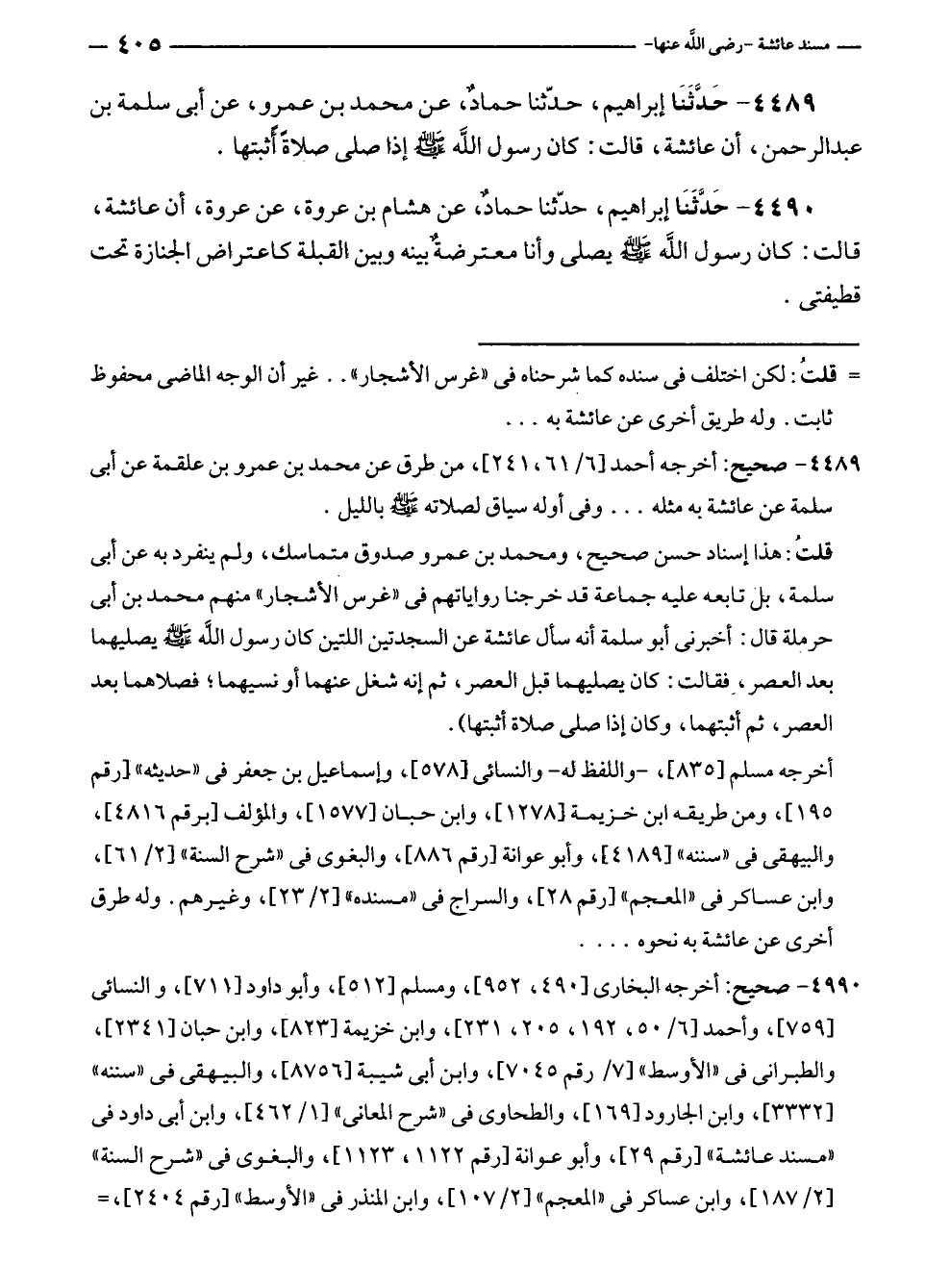 ٤٤٨٩ - حَدَّثَنَا إبراهيم، حدّثنا حمادٌ، عن محمد بن عمرو، عن أبى سلمة بن عبد الرحمن، أن عائشة، قالت: كان رسول الله - صلى الله عليه وسلم - إذا صلى صلاةً أثبتها.