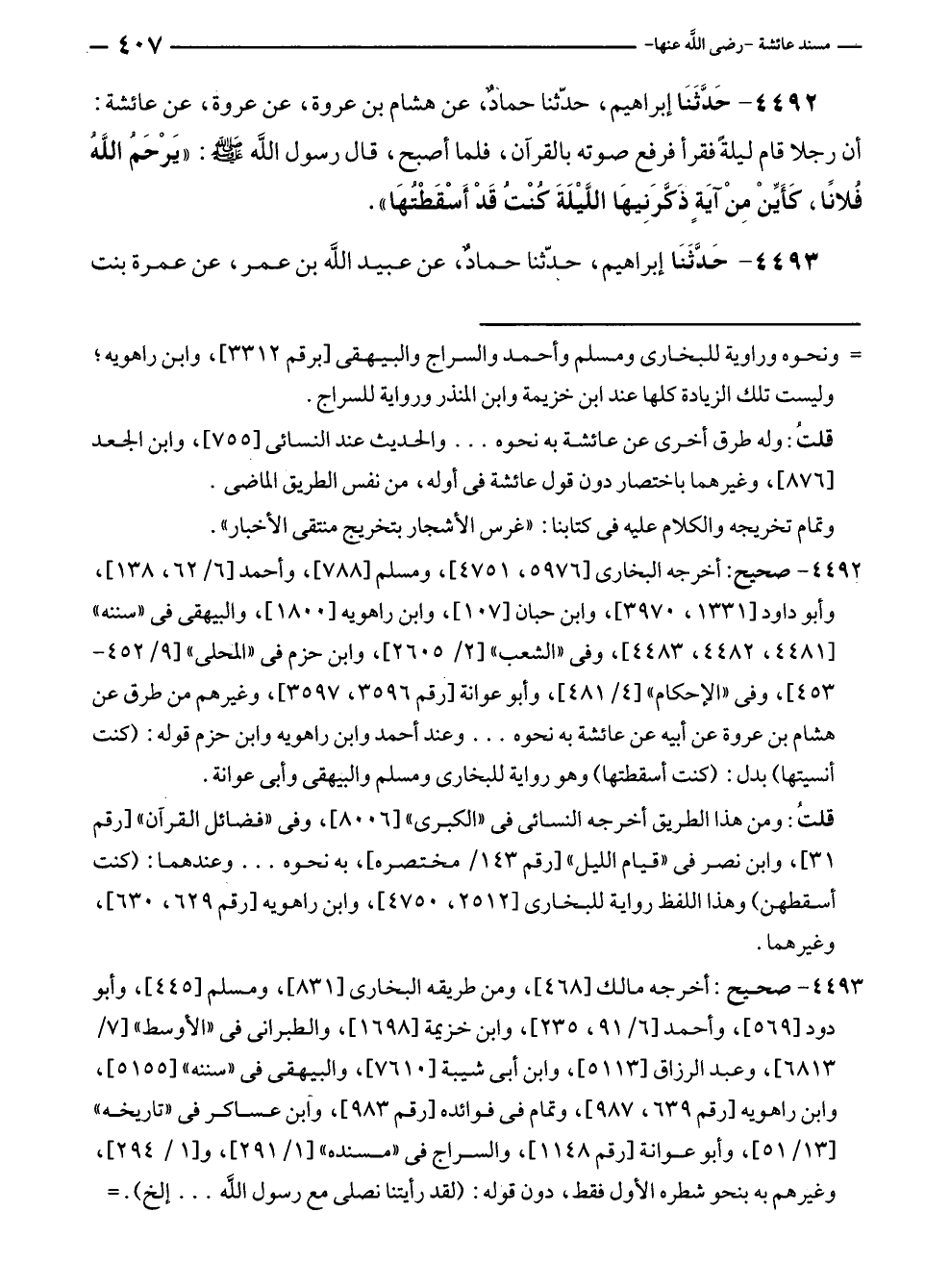 ٤٤٩٢ - حَدَّثَنَا إبراهيم، حدّثنا حماد، عن هشام بن عروة، عن عروة، عن عائشة: أن رجلا قام ليلة فقرأ فرفع صوته بالقرآن، فلما أصبح، قال رسول الله - صلى الله عليه وسلم -: "يَرْحَمْ الله فلانًا، كَأَيِّنْ مِنْ آيَةٍ ذَكرَنِيهَا اللَّيْلَةَ كنْتُ قَدْ أَسْقَطْتهَا".