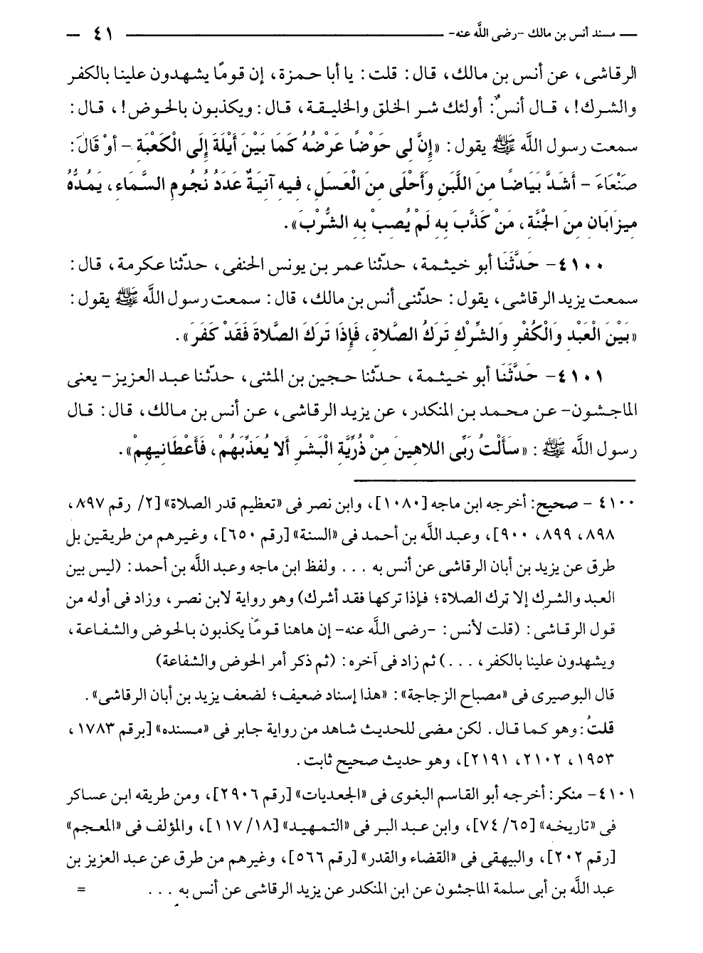 ٤١٠٠ - صحيح: أخرجه ابن ماجه [١٠٨٠]، وابن نصر في "تعظيم قدر الصلاة" [٢/ رقم ٨٩٧، ٨٩٨، ٨٩٩، ٩٠٠]، وعبد الله بن أحمد في "السنة" [رقم ٦٥٠]، وغيرهم من طريقين بل طرق عن يزيد بن أبان الرقاشي عن أنس به ... ولفظ ابن ماجه وعبد الله بن أحمد: (ليس بين العبد والشرك إلا ترك الصلاة؛ فإذا تركها فقد أشرك) وهو رواية لابن نصر، وزاد في أوله من قول الرقاشي: (قلت لأنس: - رضى الله عنه - إن هاهنا قومًا يكذبون بالحوض والشفاعة، ويشهدون علينا بالكفر، ... ) ثم زاد في آخره: (ثم ذكر أمر الحوض والشفاعة).