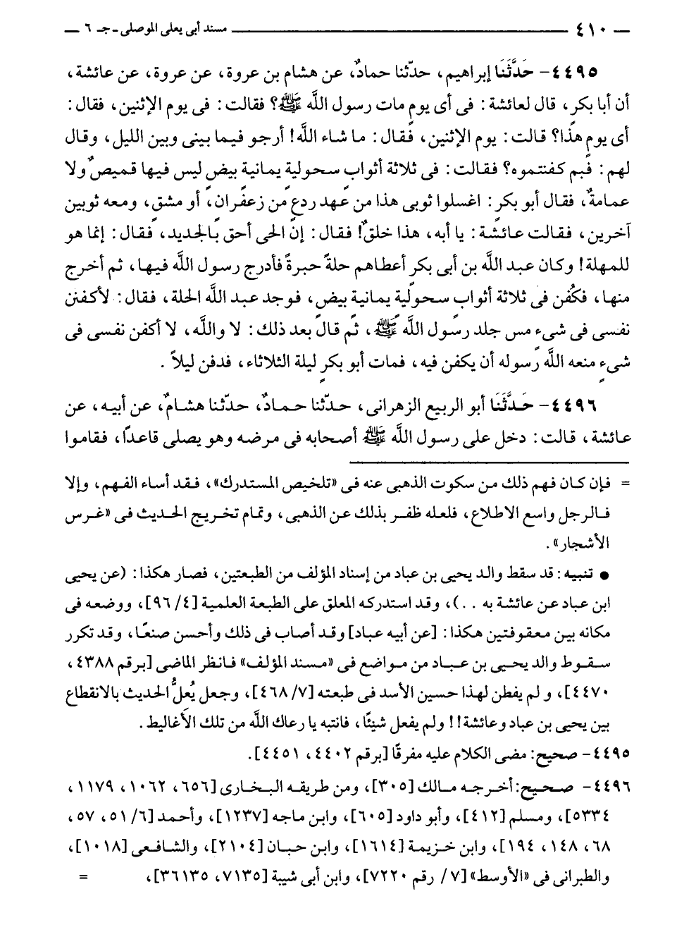 • تنبيه: قد سقط والد يحيى بن عباد من إسناد المؤلف من الطبعتين، فصار هكذا: (عن يحيى بن عباد عن عائشة به. .)، وقد استدركه المعلق على الطبعة العلمية [٤/ ٩٦]، ووضعه في مكانه بين معقوفتين هكذا: أعن أبيه عباد، وقد أصاب في ذلك وأحسن صنعًا، وقد تكرر سقوط والد يحيى بن عباد من مواضع في "مسند المؤلف" فانظر الماضى [برقم ٤٣٨٨، ٤٤٧٠]، ولم يفطن لهذا حسين الأسد في طبعته [٧/ ٤٦٨]، وجعل يُعِلُّ الحديث بالانقطاع بين يحيى بن عباد وعائشة!! ولم يفعل شيئًا، فانتبه يا رعاك الله من تلك الأغاليط.