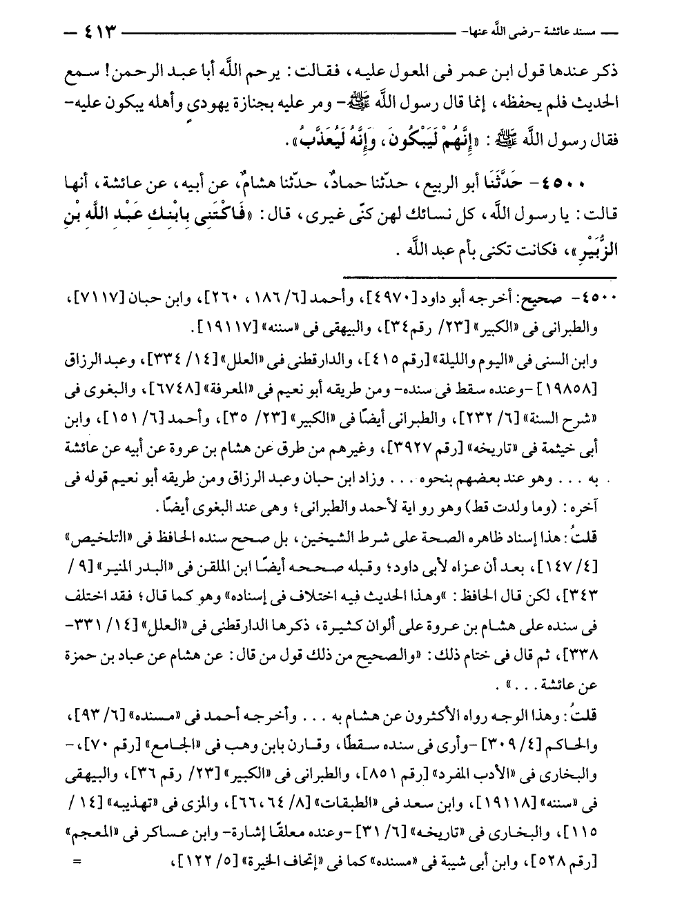 ٤٥٠٠ - حَدَّثَنَا أبو الربيع، حدّثنا حمادٌ، حدّثنا هشامٌ، عن أبيه، عن عائشة، أنها قالت: يا رسول الله، كل نسائك لهن كنًى غيرى، قال: "فَاكْتَنِى بِابْنِكِ عَبْدِ اللهِ بنِ الزُّبَيْرِ"، فكانت تكنى بأم عبد الله.