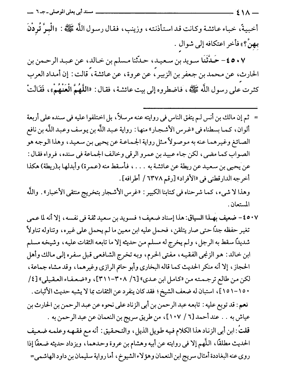 = ثم إن مالك بن أنس لم يتفق الناس في روايته عنه مرسلًا، بل اختلفوا عليه في سنده على أربعة ألوان، كما بسطناه في "غرس الأشجار" منها: رواية عبد الله بن يوسف وعبد الله بن نافع الصائغ وغيرهما عنه به موصولًا مثل رواية الجماعة عن يحيى بن سعيد، وهذا الوجه هو الصواب كما مضى، لكن جاء عبيد بن عمرو الرقى وخالف الجماعة في سنده، فرواه فقال: عن يحيى بن سعيد عن ريطة عن عائشة به ... ، فأسقط منه (عمرة) وأبدلها بـ (ريطة) هكذا أخرجه الدارقطنى في "الأفراد" [رقم ٦٣٧٨/ أطرافه].