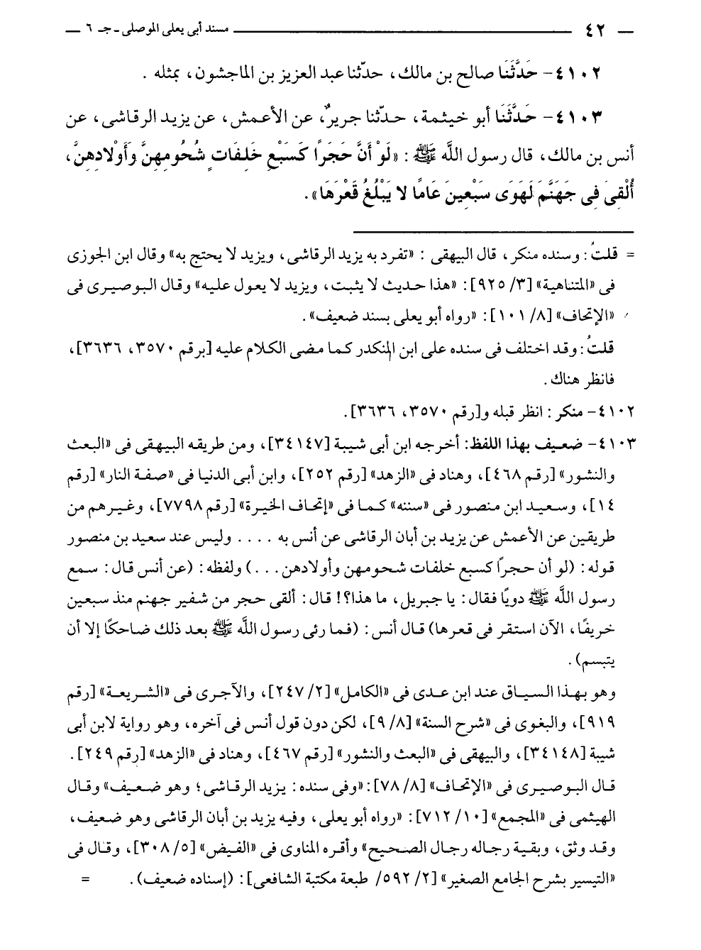 ٤١٠٣ - حَدَّثَنَا أبو خيثمة، حدّثنا جريرٌ، عن الأعمش، عن يزيد الرقاشي، عن أنس بن مالك، قال رسول الله - صلى الله عليه وسلم -: "لَوْ أَنَّ حَجَرًا كسَبْعِ خَلِفَاتٍ شحُومِهِنَّ، وَأَوْلادِهِن، أُلْقِىَ فِي جَهَنَّمَ لَهَوَى سَبْعِينَ عَامًا لا يَبْلُغُ قَعْرَهَا".
