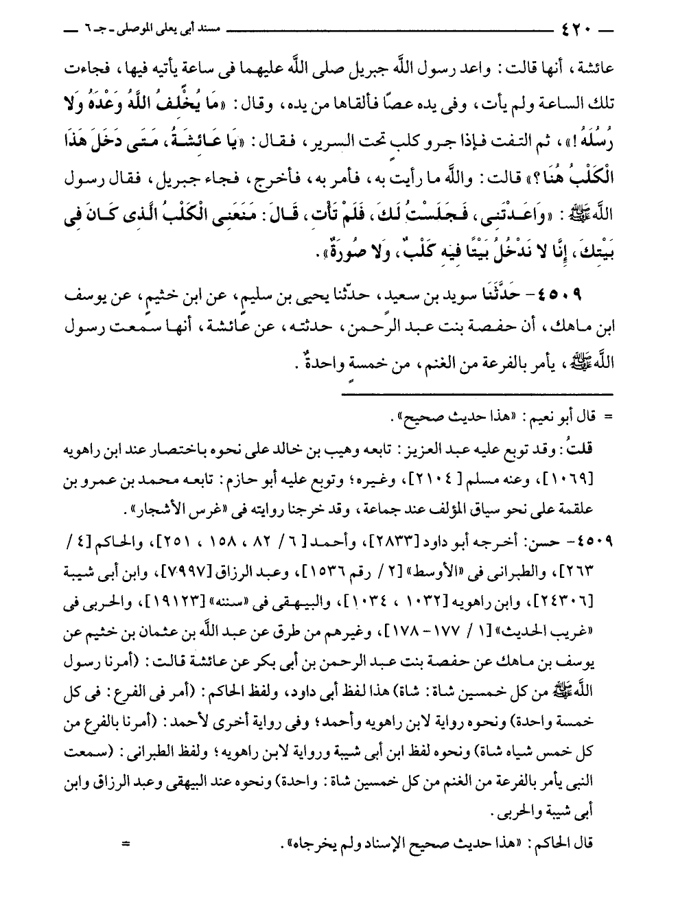 ٤٥٠٩ - حسن: أخرجه أبو داود [٢٨٣٣]، وأحمد [٦/ ٨٢، ١٥٨، ٢٥١]، والحاكم [٤/ ٢٦٣]، والطبرانى في "الأوسط" [٢/ رقم ١٥٣٦]، وعبد الرزاق [٧٩٩٧]، وابن أبى شيبة [٢٤٣٠٦]، وابن راهويه [١٠٣٢، ١٠٣٤]، والبيهقى في "سننه" [١٩١٢٣]، والحربى في "غريب الحديث" [١/ ١٧٧ - ١٧٨]، وغيرهم من طرق عن عبد الله بن عثمان بن خثيم عن يوسف بن ماهك عن حفصة بنت عبد الرحمن بن أبى بكر عن عائشة قالت: (أمرنا رسول الله - صلى الله عليه وسلم - من كل خمسين شاة: شاة) هذا لفظ أبى داود، ولفظ الحاكم: (أمر في الفرع: في كل خمسة واحدة) ونحوه رواية لابن راهويه وأحمد؛ وفى رواية أخرى لأحمد: (أمرنا بالفرع من كل خصص شياه شاة) ونحوه لفظ ابن أبى شيبة ورواية لابن راهويه؛ ولفظ الطبراني: (سمعت النبي يأمر بالفرعة من الغنم من كل خمسين شاة: واحدة) ونحوه عند البيهقى وعبد الرزاق وابن أبى شيبة والحربى.