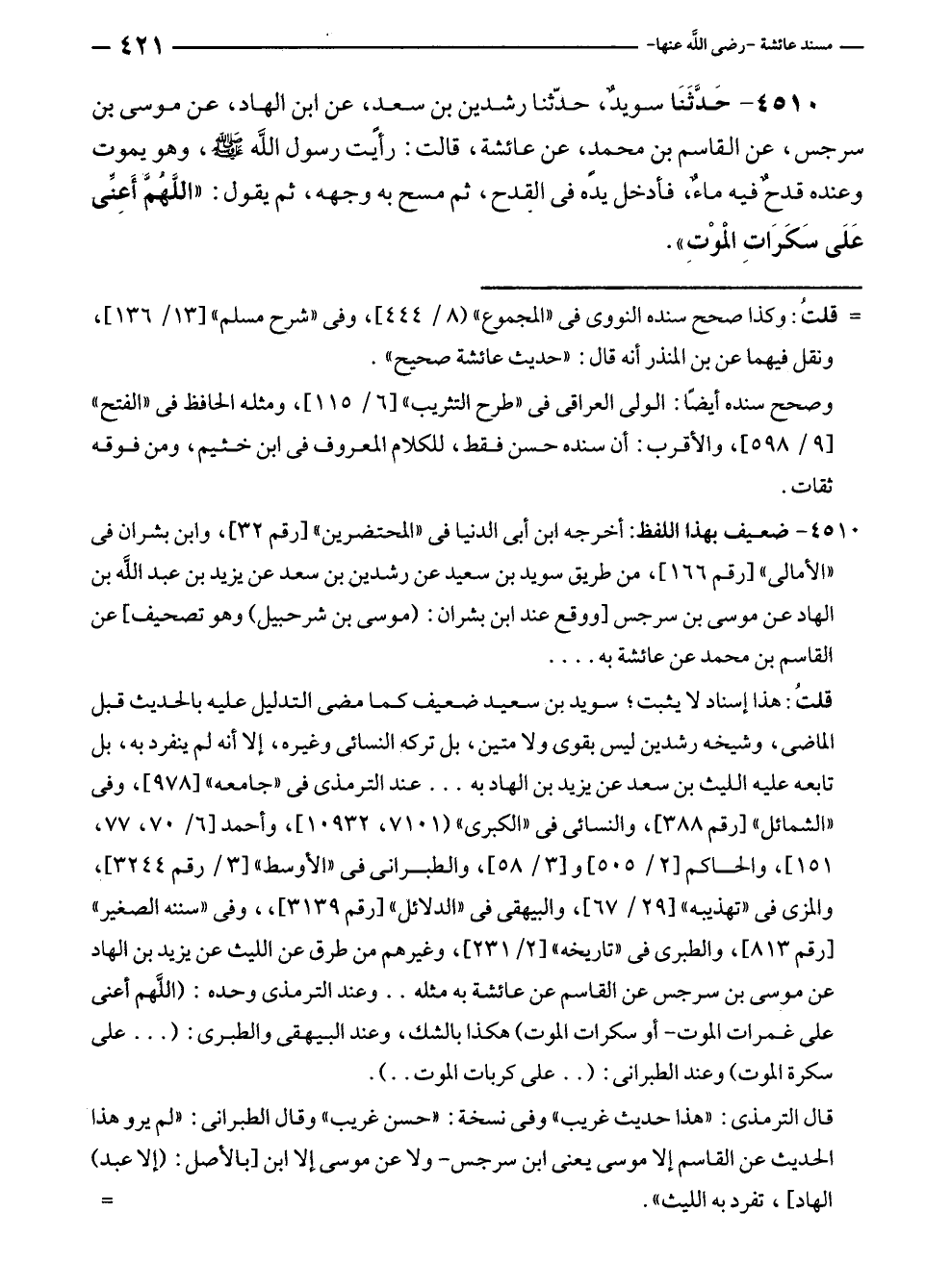 قلتُ: هذا إسناد لا يثبت؛ سويد بن سعيد ضعيف كما مضى التدليل عليه بالحديث قبل الماضى، وشيخه رشدين ليس بقوى ولا متين، بل تركه النسائي وغيره، إلا أنه لم ينفرد به، بل تابعه عليه الليث بن سعد عن يزيد بن الهاد به ... عند الترمذى في "جامعه" [٩٧٨]، وفى "الشمائل" [رقم ٣٨٨]، والنسائى في "الكبرى" [٧١٠١، ١٠٩٣٢]، وأحمد [٦/ ٧٠، ٧٧، ١٥١]، والحاكم [٢/ ٥٠٥] و [٣/ ٥٨]، والطبرانى في "الأوسط" [٣/ رقم ٣٢٤٤]، والمزى في "تهذيبه" [٢٩/ ٦٧]، والبيهقى في "الدلائل" [رقم ٣١٣٩]، وفى "سننه الصغير" [رقم ٨١٣]، والطبرى في "تاريخ" [٢/ ٢٣١]، وغيرهم من طرق عن الليث عن يزيد بن الهاد عن موسى بن سرجس عن القاسم عن عائشة به مثله .. وعند الترمذى وحده: (اللَّهم أعنى على غمرات الموت - أو سكرات الموت) هكذا بالشك، وعند البيهقى والطبرى: ( ... على سكرة الموت) وعند الطبراني: ( .. على كربات الموت .. ).