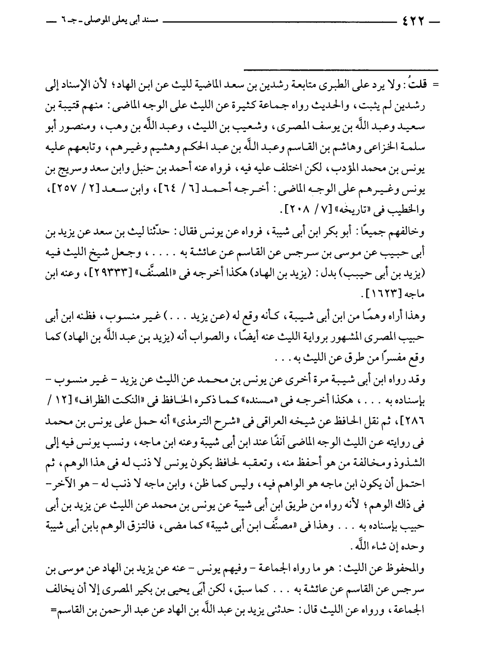 وخالفهم جميعًا: أبو بكر بن أبى شيبة، فرواه عن يونس فقال: حدّثنا ليث بن سعد عن يزيد بن أبى حبيب عن موسى بن سرجس عن القاسم عن عائشة به .... ، وجعل شيخ الليث فيه (يزيد بن أبى حيبب) بدل: (يزيد بن الهاد) هكذا أخرجه في "المصنَّف" [٢٩٣٣٣]، وعنه ابن ماجه [١٦٢٣].