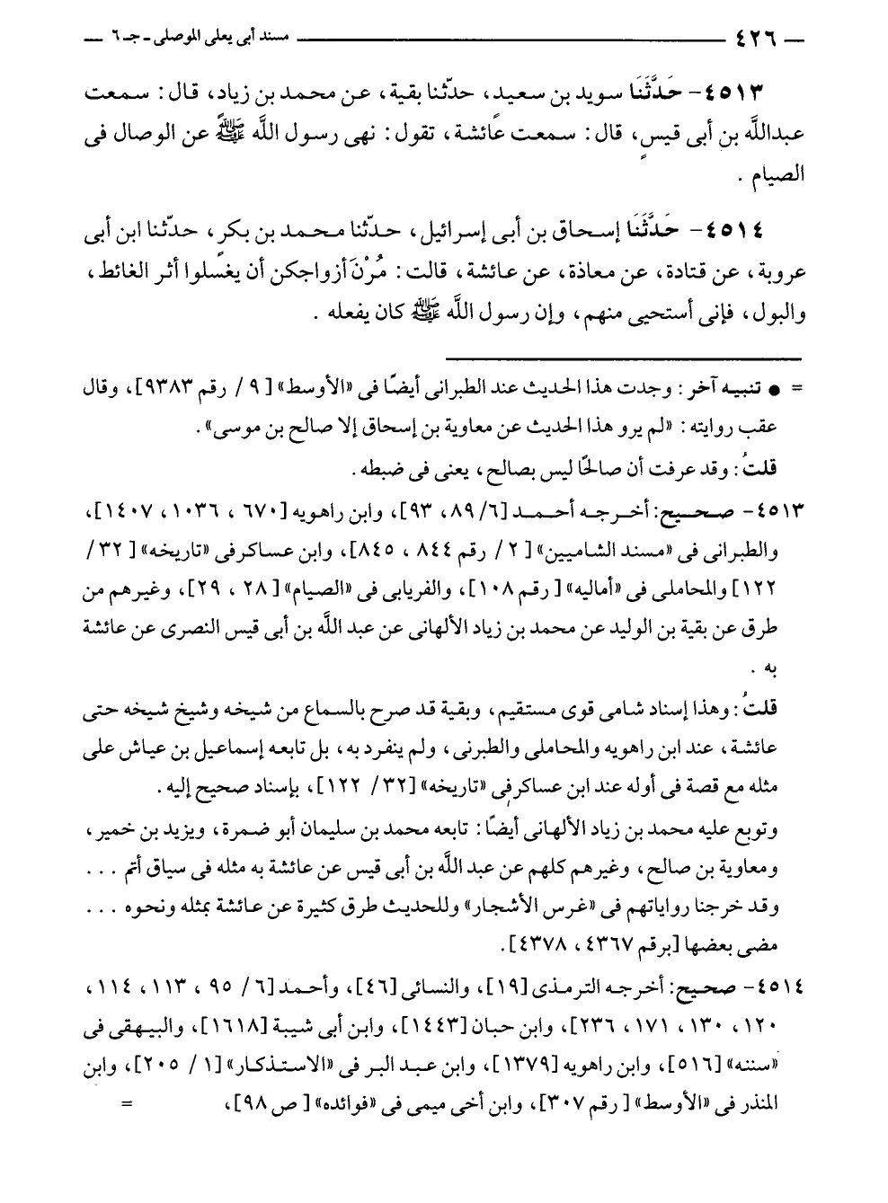 ٤٥١٣ - صحيح: أخرجه أحمد [٦/ ٨٩، ٩٣]، وابن راهويه [٦٧٠، ١٠٣٦، ١٤٠٧]، والطبرانى في "مسند الشاميين" [٢/ رقم ٨٤٤، ٨٤٥]، وابن عساكر فى "تاريخه" [٣٢/ ١٢٢] والمحاملى في "أماليه" [رقم ١٠٨]، والفريابى في "الصيام" [٢٨، ٢٩]، وغيرهم من طرق عن بقية بن الوليد عن محمد بن زياد الألهانى عن عبد الله بن أبى قيس النصرى عن عائشة به.