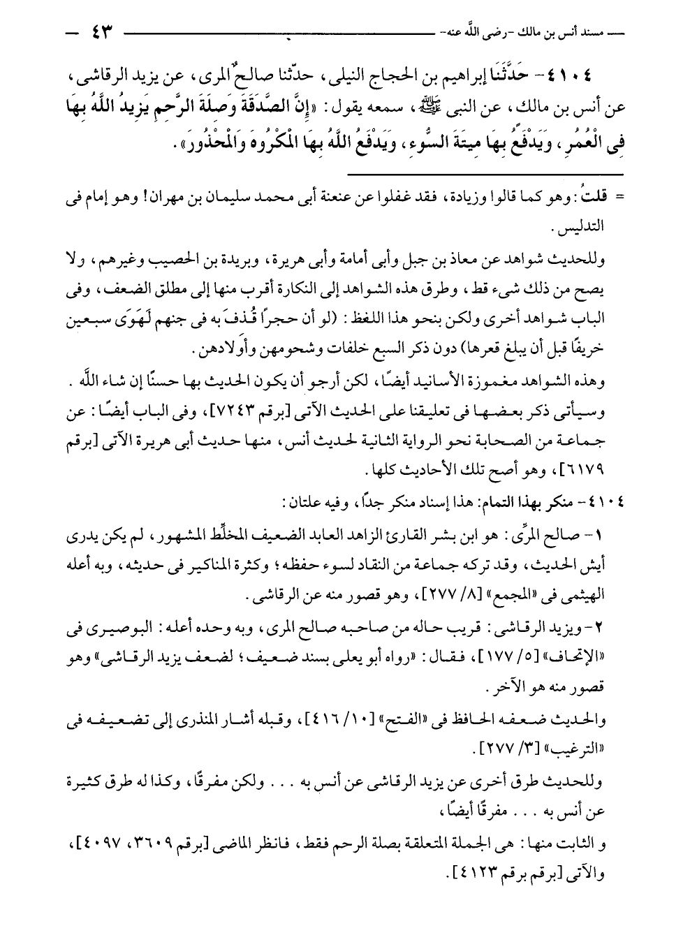 ٤١٠٤ - حَدَّثَنَا إبراهيم بن الحجاج النيلى، حدّثنا صالحٌ المرى، عن يزِيد الرقاشي، عن أنس بن مالك، عن النبي - صلى الله عليه وسلم -، سمعه يقول: "إِنَّ الصَّدَقَة وَصِلَةَ الرَّحِمِ يزِيدُ اللَّهُ بِهَا فِي الْعُمُرِ، وَيَدْفَعُ بِهَا مِيتَةَ السُّوءِ، وَيَدْفَعُ اللَّهُ بِهَا المكْرُوهَ وَالمحْذُورَ".