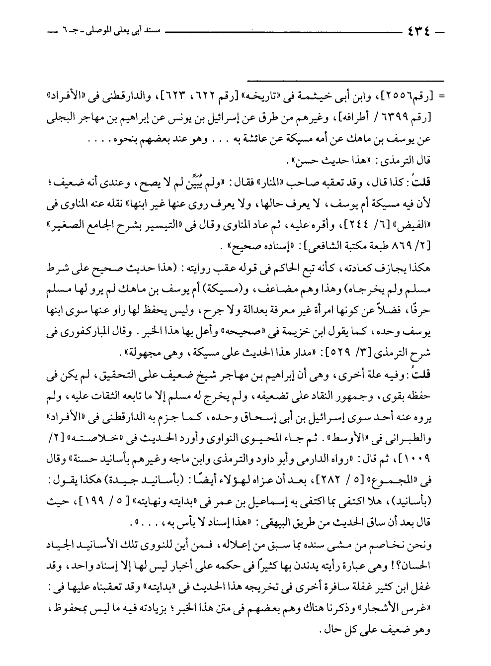 هكذا يجازف كعادته، كأنه تبع الحاكم في قوله عقب روايته: (هذا حديث صحيح على شرط مسلم ولم يخرجاه) وهذا وهم مضاعف، و (مسيكة) أم يوسف بن ماهك لم يرو لها مسلم حرفًا، فضلًا عن كونها امرأة غير معرفة بعدالة ولا جرح، وليس يحفظ لها راو عنها سوى ابنها يوسف وحده، كما يقول ابن خزيمة في "صحيحه" وأعل بها هذا الخبر. وقال المباركفورى في شرح الترمذى [٣/ ٥٢٩]: "مدار هذا الحديث على مسيكة، وهى مجهولة".